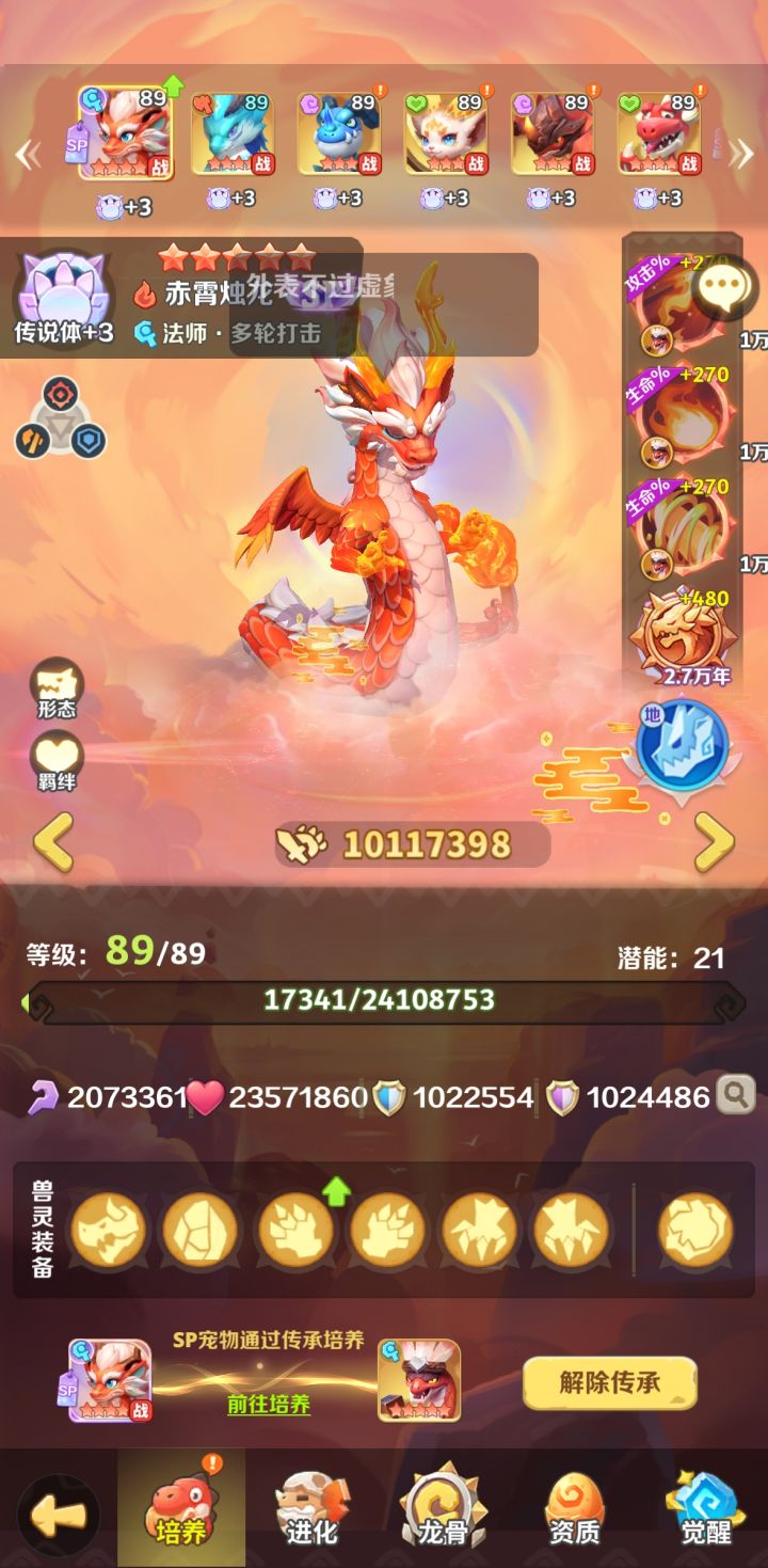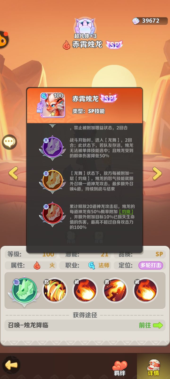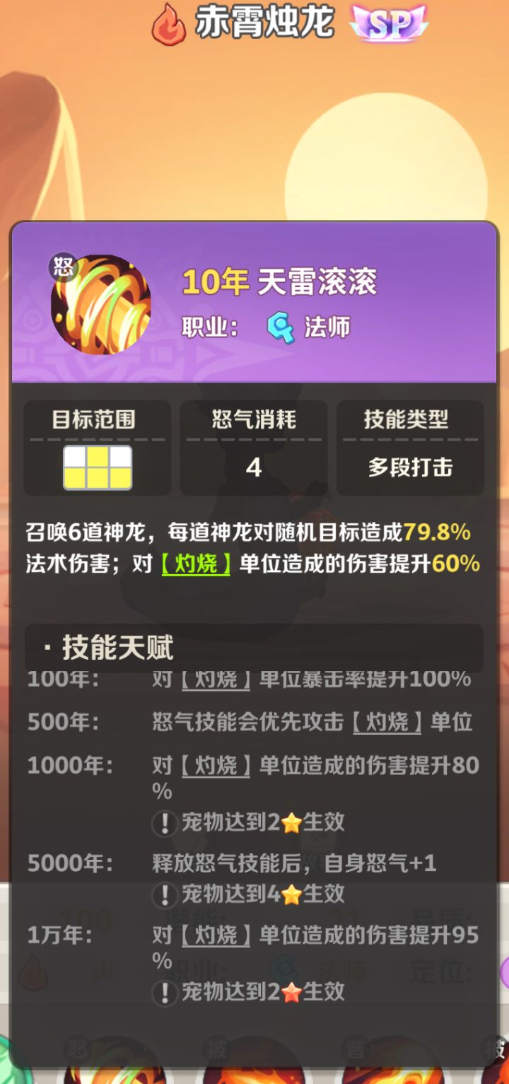 火系SP宠 - 赤霄烛龙(养成建议)【小名】:火龙、烛龙、蛇龙【抽蛋难度】:★★★★★【宠物强度】:★★★★★【特点】:火系新晋SP宠,主打多轮加成伤害。【下位替代】:无替代宠物。【定位】:建议火系强攻法队伍使用。【兽灵】:森林神鹿4件套+烈焰暴龙2件套,主打少数回合爆炸增伤优先。【龙骨效果】:攻击百分比优先、生命百分比其次,再没有暴击、攻击也可以。【通用龙骨】: