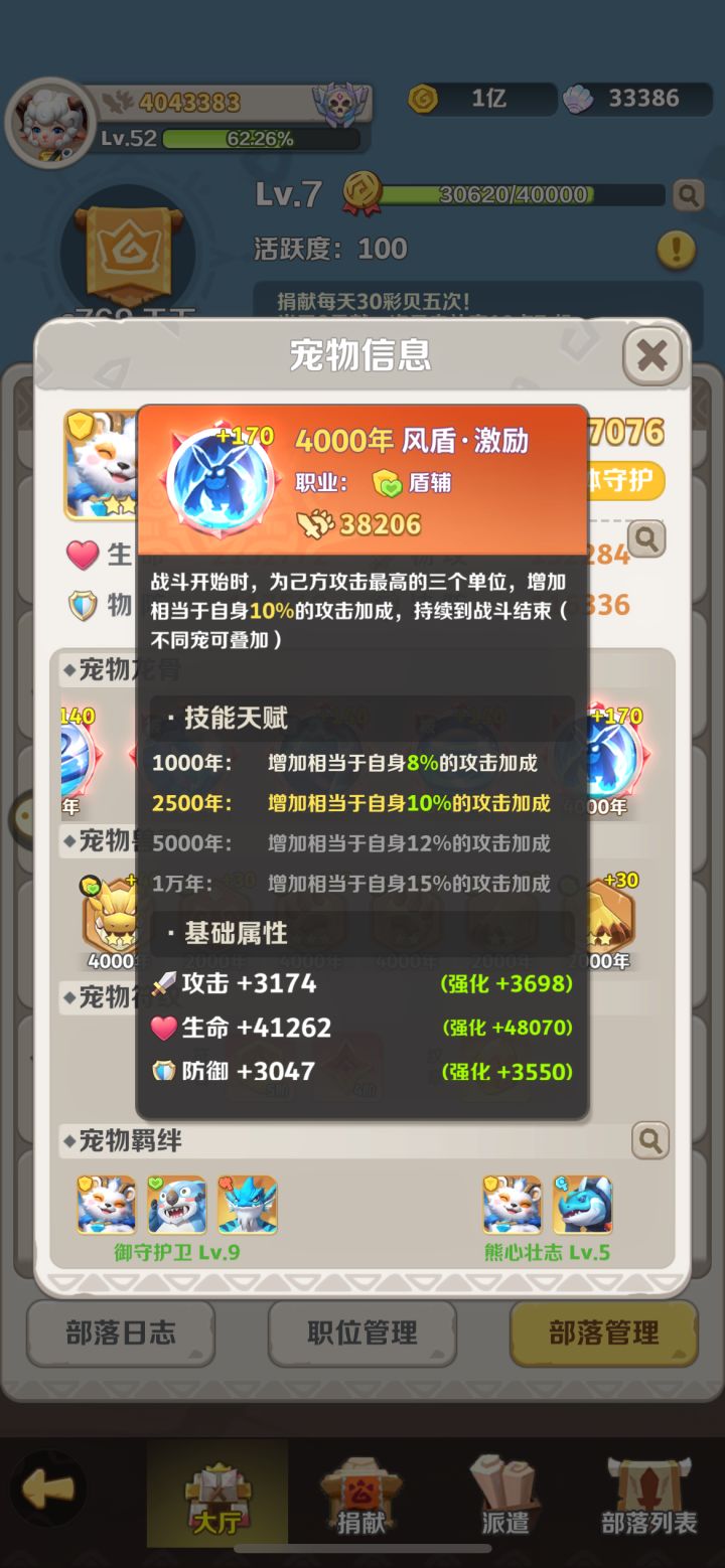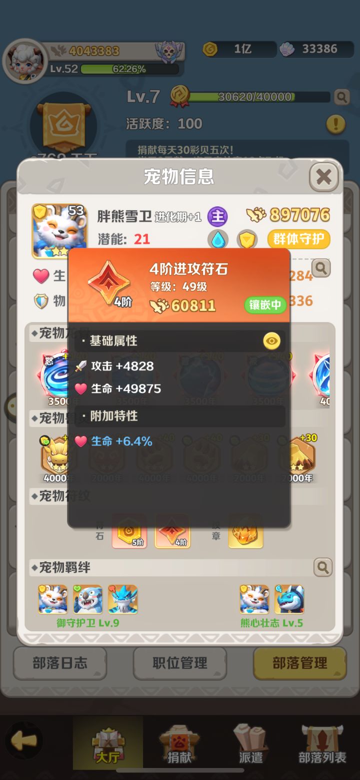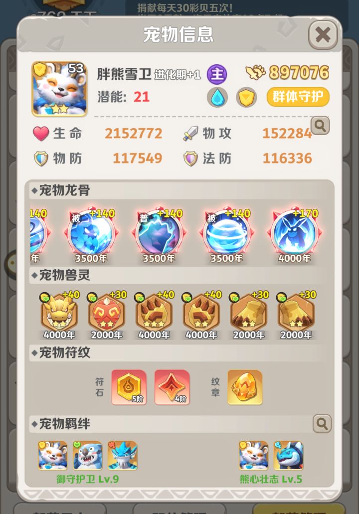 能多肉就多肉,攻击、守护符石都以加血为主,第五龙骨也是(激励),做为队伍中的保卫队长,必须确保队友活着,可以搭配猩猩,效果加倍!