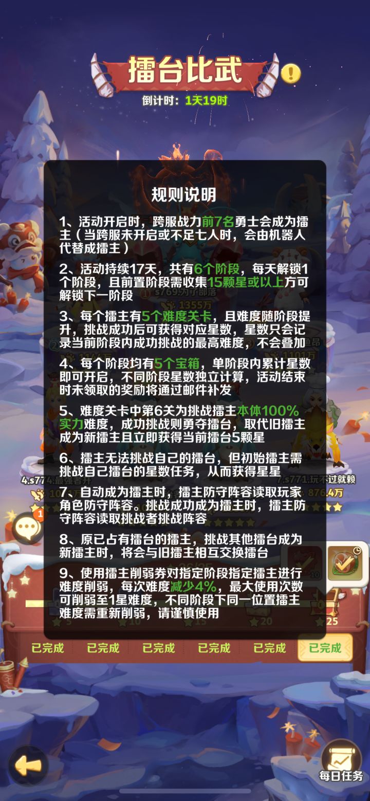 我觉得雷灵活动的擂台活动后期如果还有的话应该也要调整下,不然对新手轻氪或中氪玩家太不友好,擂台共分六个阶段,每一阶段需完成15颗星或以上才能解锁下一阶段,强烈建议每阶段的擂主战力应该在隔天后锁定前一天的战力,不应该随着擂主的战力提升去同步更新,比如第一天的0点前擂主战力500万,第一阶段的擂主战力就锁定在500万,第二阶段就以第二天的战力为准,不然擂主的提升跟下层的玩家提升根本不在一个水