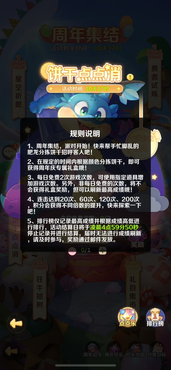 饼干点点消,点点乐应该怎么玩?每日免费2次游戏次数,可使用指定道具增加游戏次数。另外,非每日免费的次数,将不会获得礼盒奖励,但可以刷新最高成绩!新推出的小游戏,确实非常好玩,测试酋长的反应跟速度能力,我给各位酋长测试过单手以及双手玩,结果发现还是双手速度会快些,当然也是看各位的习惯,指不准有些人就是喜欢一阳指。点点乐的排名奖励也是非常诱人,第一、二、三名,分别都有100、90、80个饼
