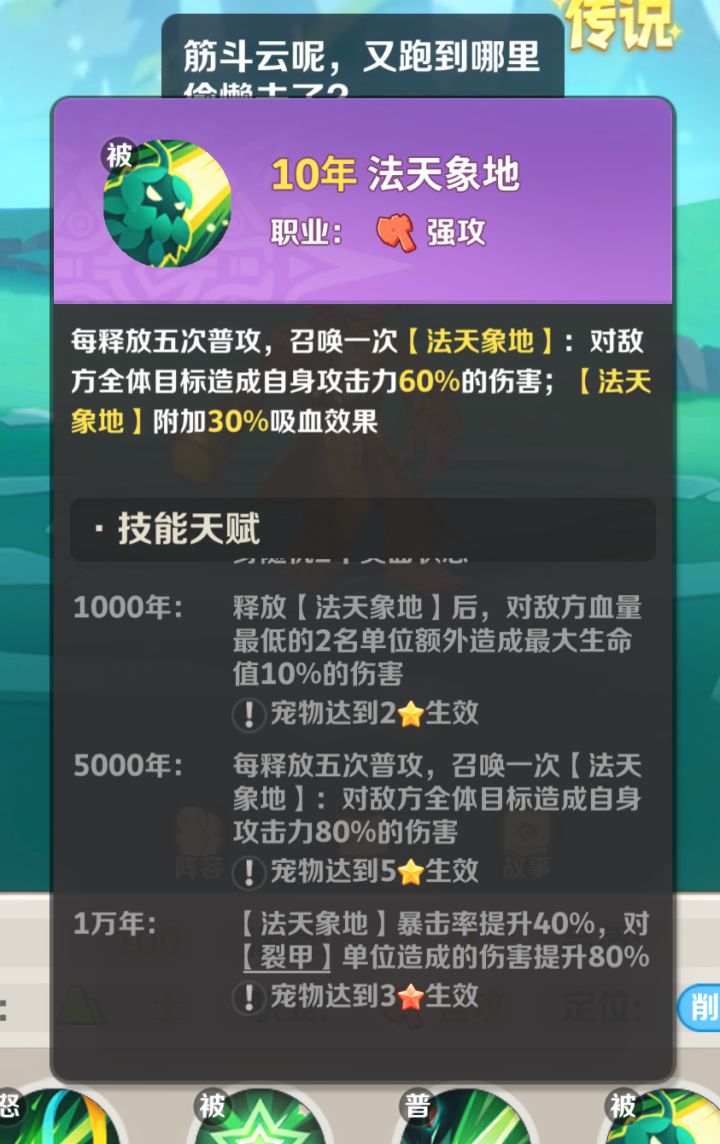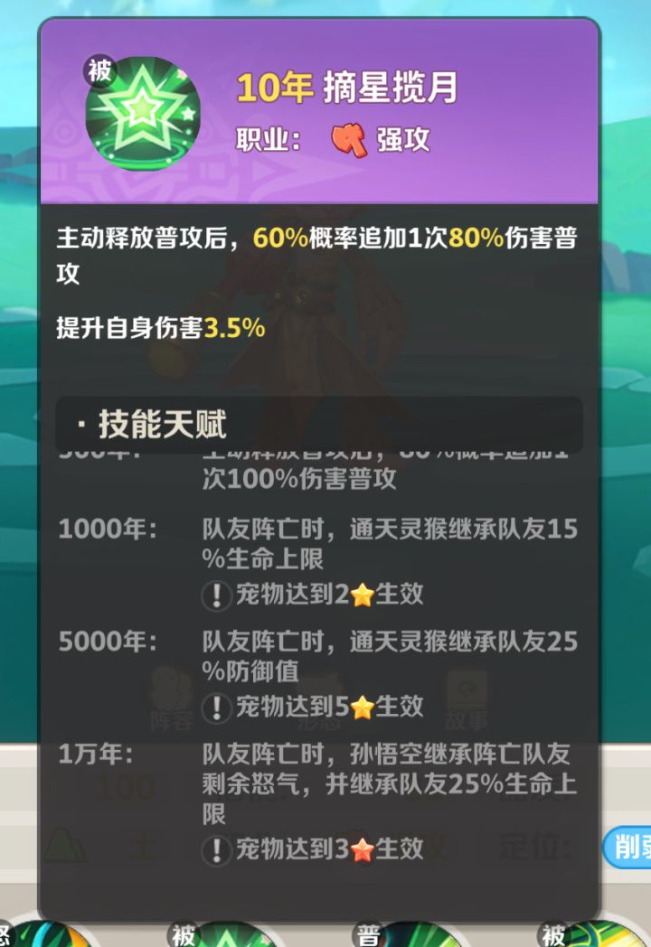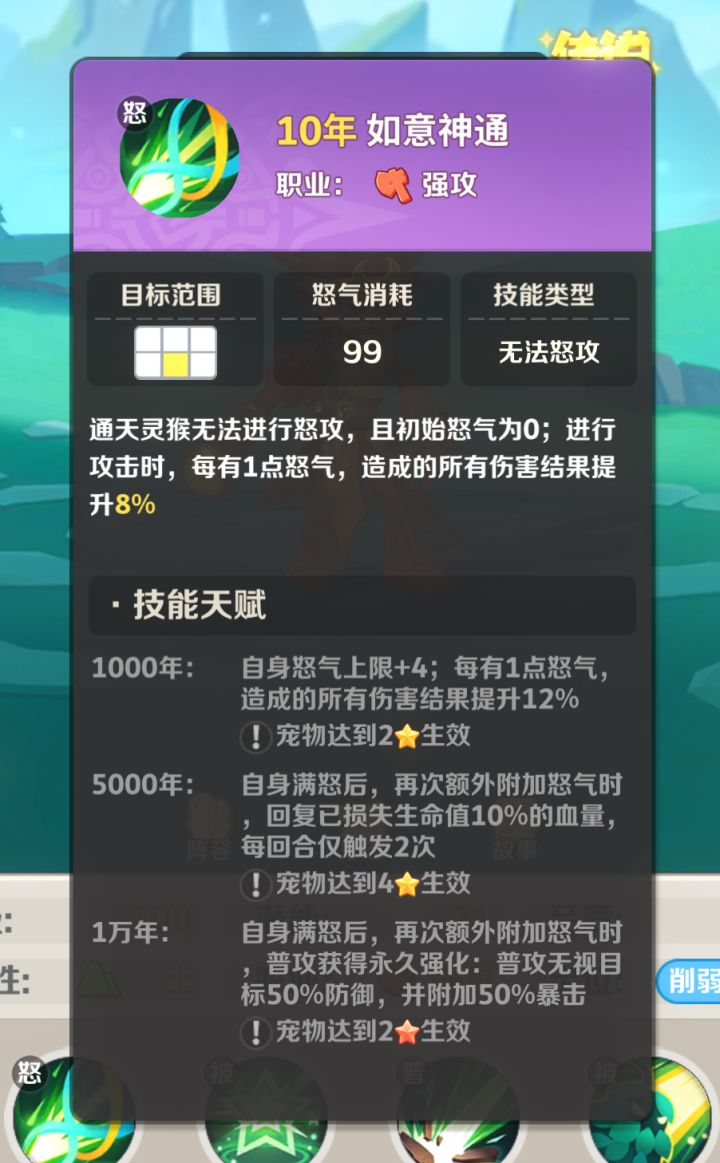 通天灵猴(养成建议)【小名】:悟空、猴子、大师兄【抽蛋难度】:★★★☆☆【宠物强度】:★★★★☆【特点】:土系新晋强攻宠,普攻至上,怒气增伤,大招技能效果很有震撼感!【下位替代】:大力猿。【定位】:建议土系或风系队伍使用,当主C来用。【兽灵】:大地狂猿4件+新兽灵狂猎海象2件,第三回合后开始爆发收割。【龙骨效果】:攻击百分比、生命百分比优先,暴击、攻击其次。【通用龙骨】:首选:剑
