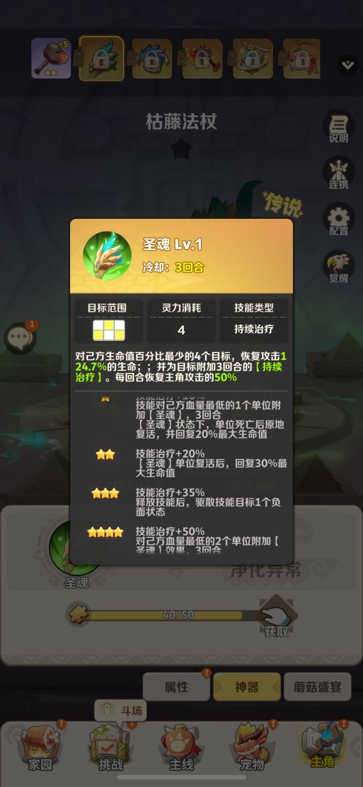 神器上的更新跟平衡还需优化,宠物上增加负面增益的宠物已然非常多样,如最近新出的雷灵、魔鳄,控制、毒伤,但神器上消除负面增益目前所知仅有两个,三星的枯藤法杖:释放技能驱散技能目标1个负面状态,缺点:仅4个单位,且现在负面增益太多仅驱散1个实在太少,虽说枯藤的主要作用是回血+复活,五星的龙脉琼华:祝福状态下,单位血量首次低于35%时,驱散自身所有负面状态(包括控制),单场战斗仅触发一次,缺点:通常你血