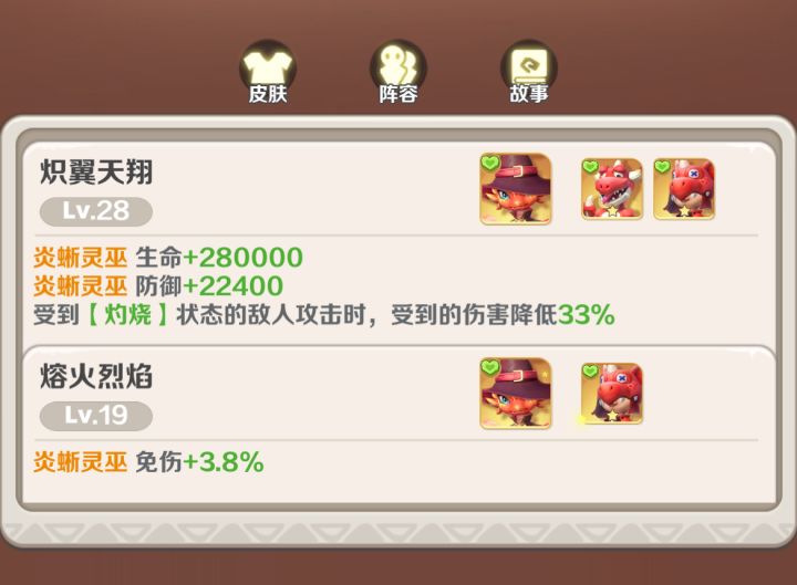 【小名】:女巫、火蜥蜴、灵巫、火巫【抽蛋难度】:★★★★☆【宠物强度】:★★★★★【特点】:攻守兼备,四系均可使用的辅助,搭配主C输出。【下位替代】:没有火蜥蜴可上火牛。【宠物定位】:全体灼烧、友方增益、阵亡反击。【兽灵】:电闪雷鸣4件+极‧财源灵狐2件,最大化辅助队中主C。【龙骨效果】:生命百分比优先、攻击百分比/抗暴其次。【通用龙骨】:首选:激励+逆转,备选:空明/遗言/恩泽。