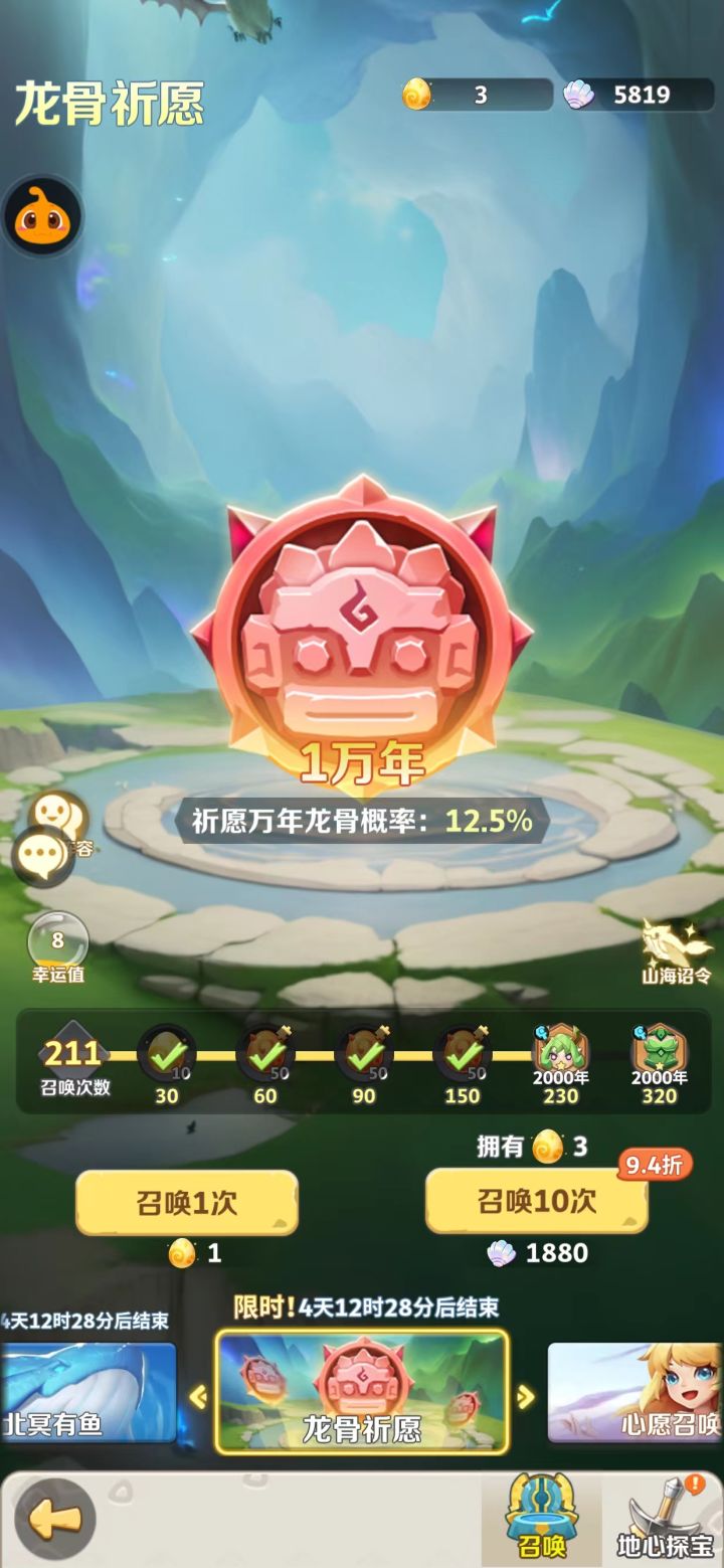 新宠物-吞海巨鲲必须获得后才能参加1万能龙骨活动,限制了很多玩家,因为很难获得新宠(小编200抽还没获得),听说300抽保底,但召唤活动先开,已经消耗了大量召唤蛋。介意下次新宠活动和召唤活动同时开启,不要玩这种时间错开几天的玩法,弄的非常蛋疼!!!#最后的原始人