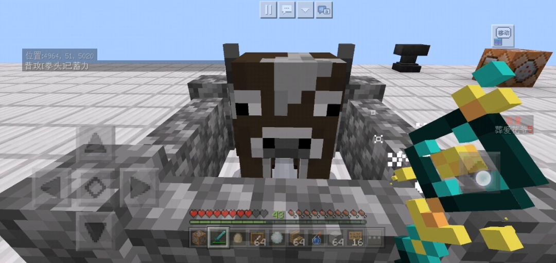 目前租赁服还在建造阶段,下面演示的是普攻系统,抛弃了原版普攻,运用了命令方块使用的计分板血量