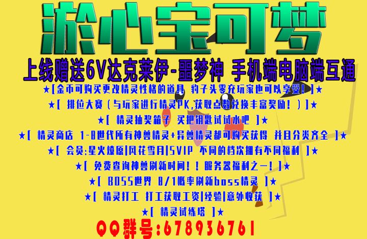 [淤心宝可梦|上线赠送6v达克莱伊|金币改性格----------------------------------------------------服务器名:淤心宝可梦🤖手机电脑均可玩 数据互通主要玩法:宝可梦 精灵排位 精灵BOSS 精灵试炼 精灵打工 发红包|抢红包MOD: 神奇宝贝8.2.0 精灵追踪 食物工艺服务器交流:678936761服务器福利:上线赠送6V达克莱伊-