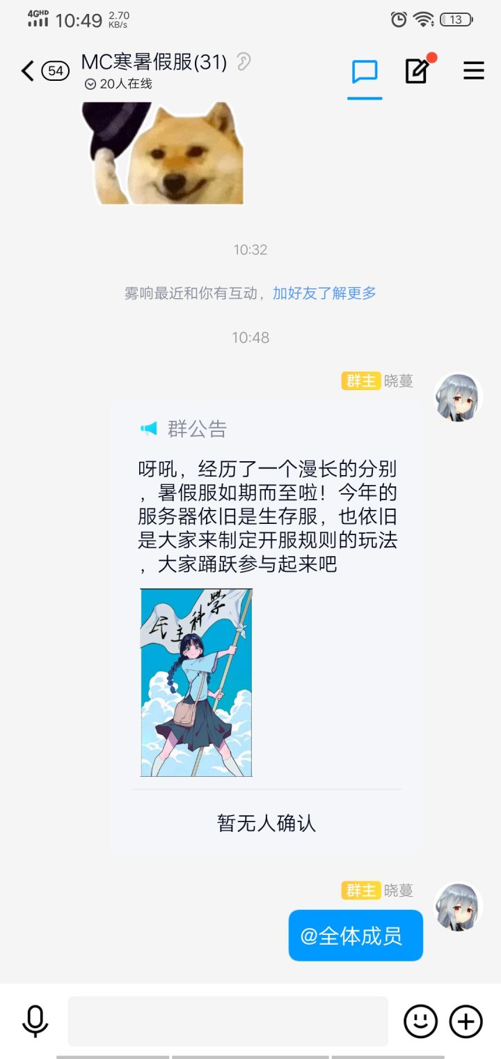 本服含有以下要素:消失的群主和摸鱼的管理十年清朝老mc玩家和从来不上线的群友生电佬骇人听闻的生电建筑看不懂群公告的一眼dz久居冷宫的广寒宫宫主以及生存建筑党今天肝什么等等无论你是老咸鱼还是真萌新,我们来者不拒,顺带一提暑期免押金哦所以,各位萌新大佬们速来!