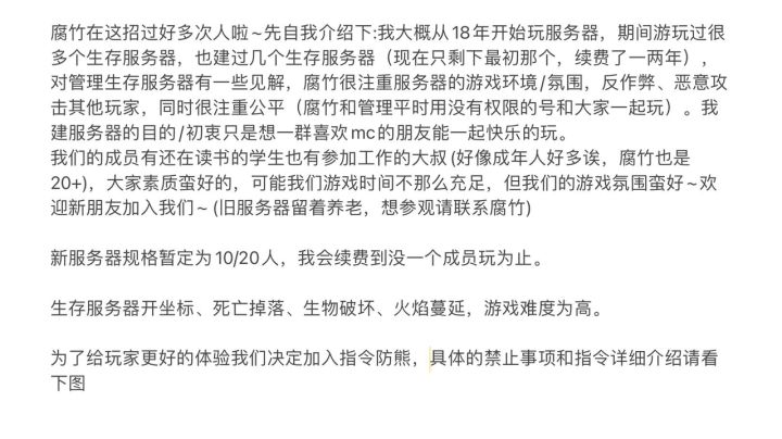 生存服务器招人~大概明天晚上开服~(wy)服务器开坐标、死亡掉落、生物破坏、火焰蔓延、昼夜交替,游戏难度为困难。服务器版本与正式服一致(iOS玩家不能抢先更新,所以等应用商店更新再一起更新)详细信息请看下图