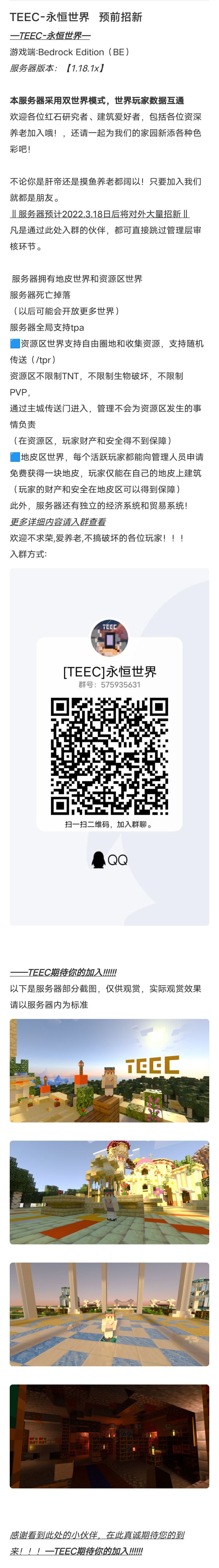 这里既有紧张刺激的生存挑战〔腐竹人工增加生存难度〕,也可以给你轻松舒适的生活节奏,不论是喜欢挑战的生存大佬,还是喜欢建筑的建造大佬都可以来!腐竹跟成员沙雕和睦,友善热情,还有会转的风车教程!只要你不熊,欢迎加入!来吧,方块人!