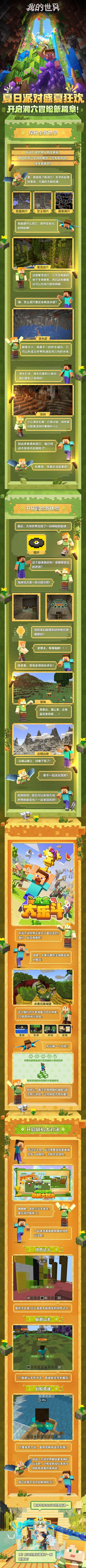 夏日派对即将开启大家准备好了吗?就在今天《我的世界》洞穴冒险新篇章正式上线!冒险家们有没有更新体验呢?在全新版本里新增了多种洞穴地形方块世界变得越来越丰富繁茂洞穴、溶洞、噪声洞穴...冒险家们知道这些洞穴都有什么特点吗?更有全新小游戏合集玩法水果大乐斗惊喜上线冒险家们可以与小伙伴开启欢乐联机冒险