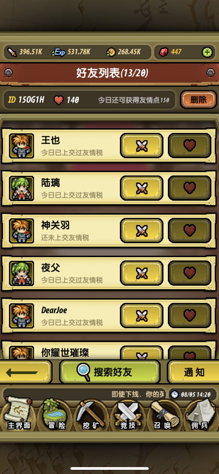 开服没几天,已经有4天没登陆的好友了,准备删掉了,希望找一些长期在线的hxd送心心,本人是个混子,不提战力不肝jjc,当做养老游戏来玩。本身也是私服和以前正式服退役玩家,求肝帝们带带俺哟