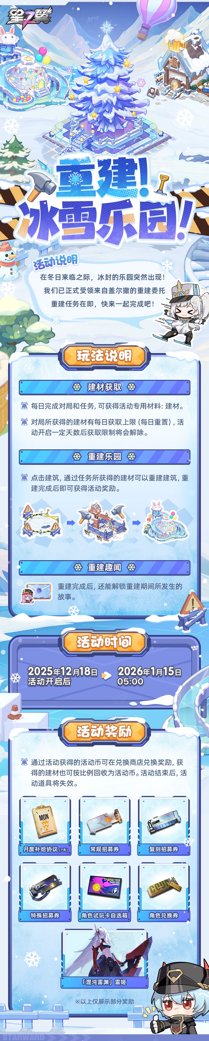 冰雪节活动【重建!冰雪乐园!】现已在游戏内开启!▼活动时间▼2025/12/18 (活动开启后) - 2026/1/15(05:00)▼活动玩法介绍▼#星之翼 #格斗游戏 #活动福利