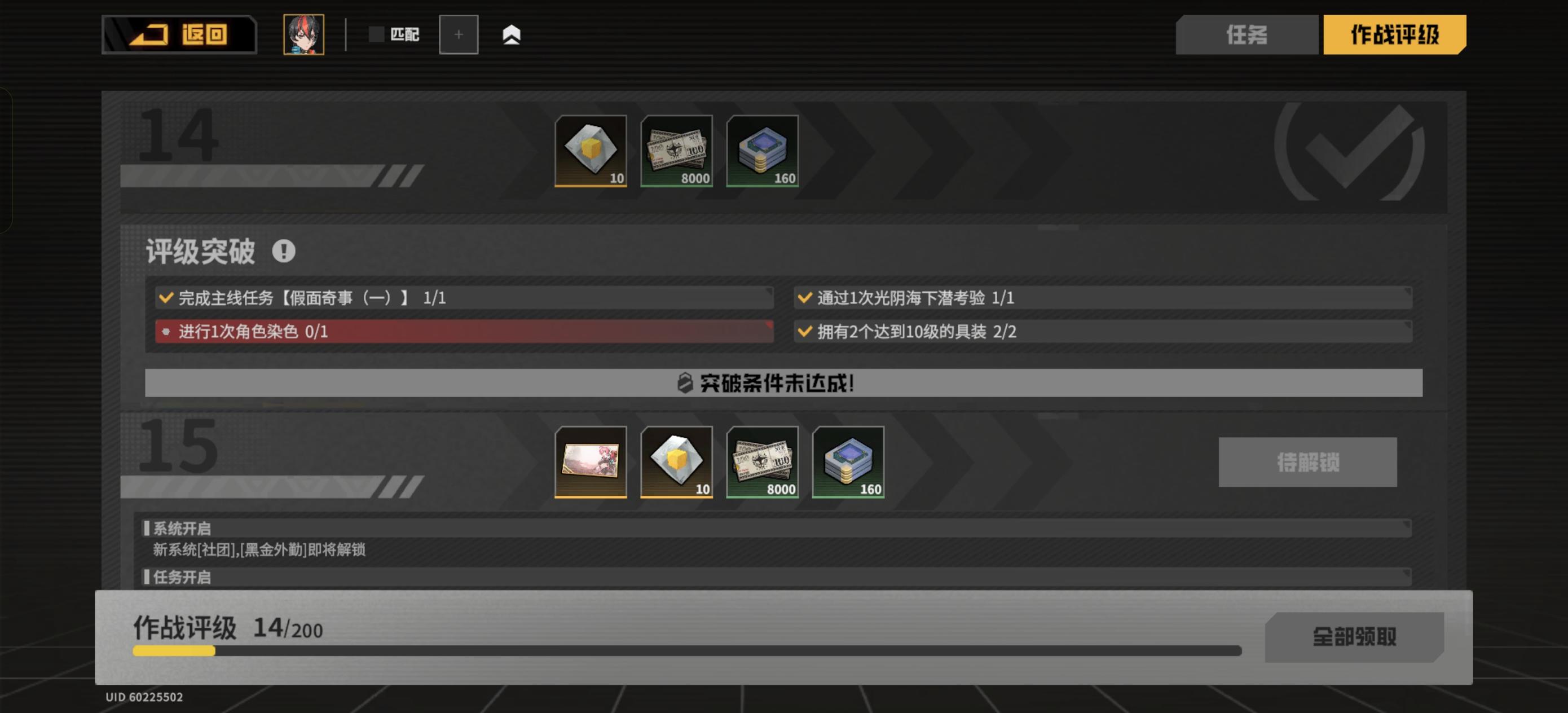 wk,有没搞错,一开始我想半天没想到这个10级具装怎么搞。具装拉了几个,最高都只能5级,搞得我以为要紫色以上才能10级。后来我想了想可能写错了,这应该是角色,然后我刷了一下角色等级。才发现还真是两10级角色。我只能说这种错误到现在都没改也是够牛的。还有那个角色染色,材料是要自己买的,奖励甚至不够买一个材料,你游任务设计真的太棒了。哦还有2.0重置了新手教程,直接强制我再刷了一遍。我进游戏都懵了,以