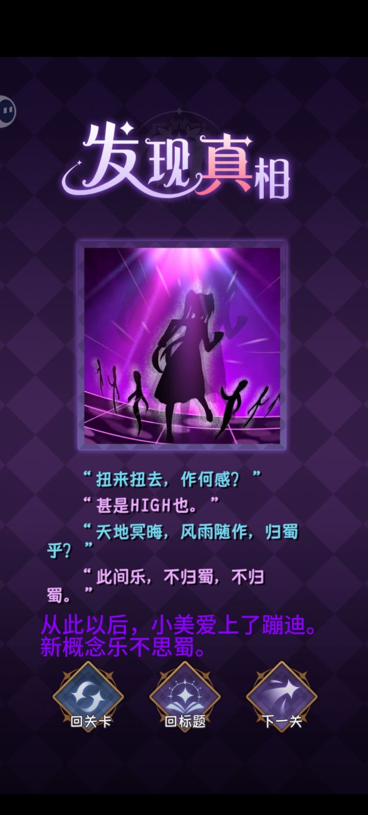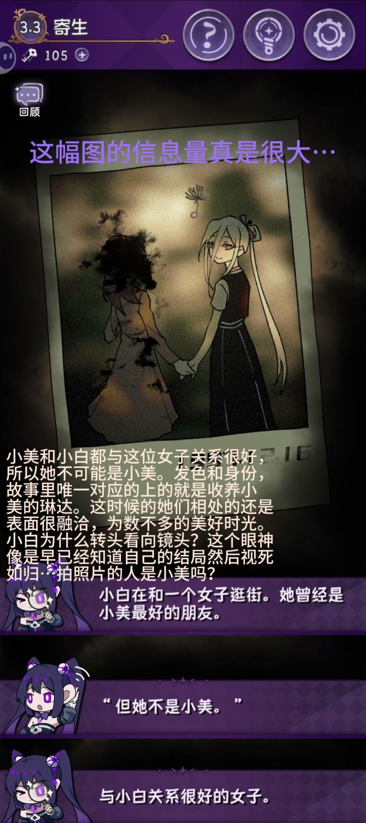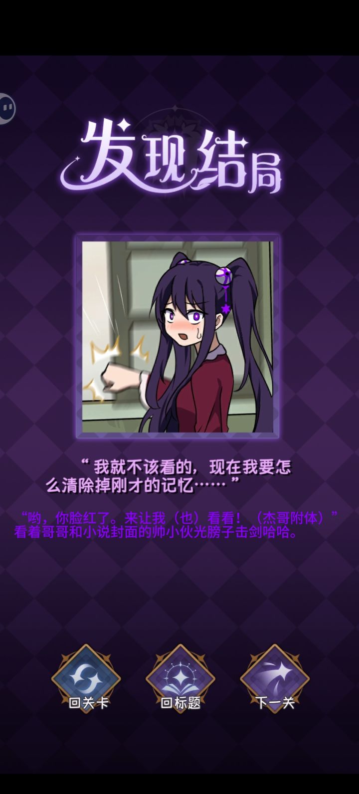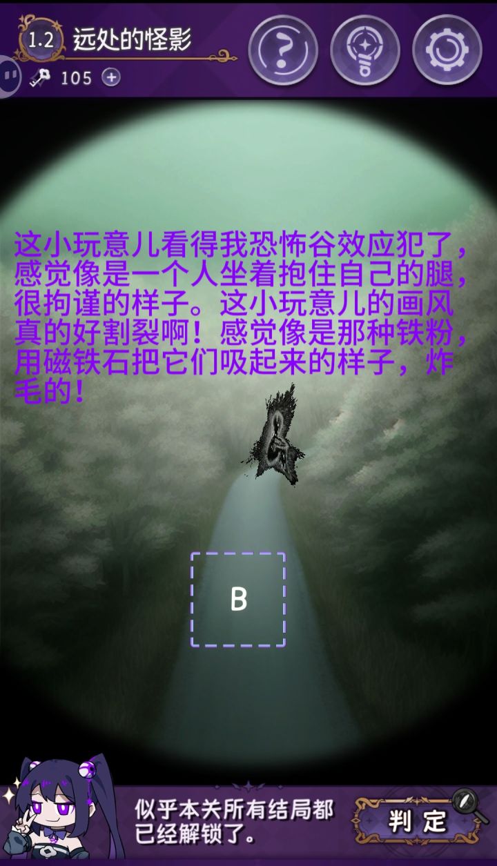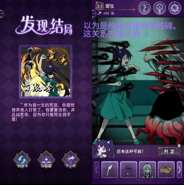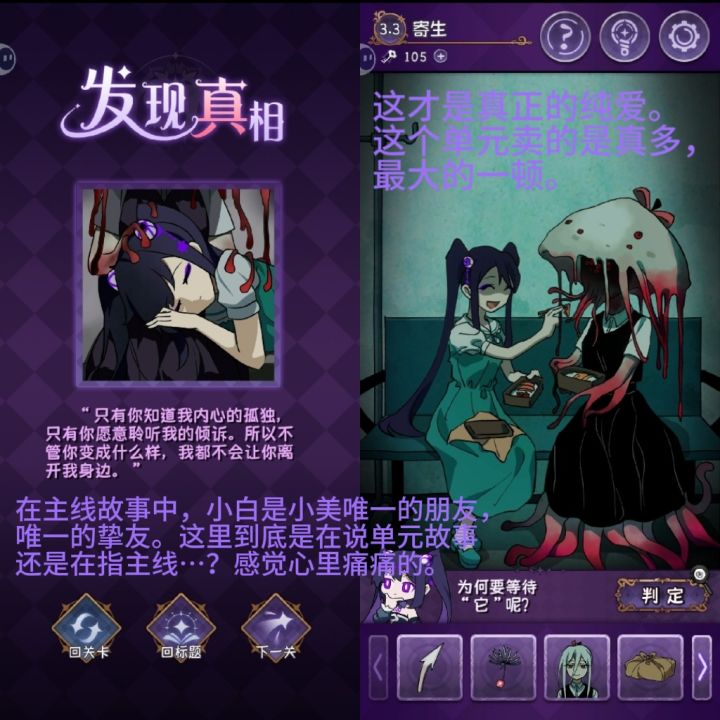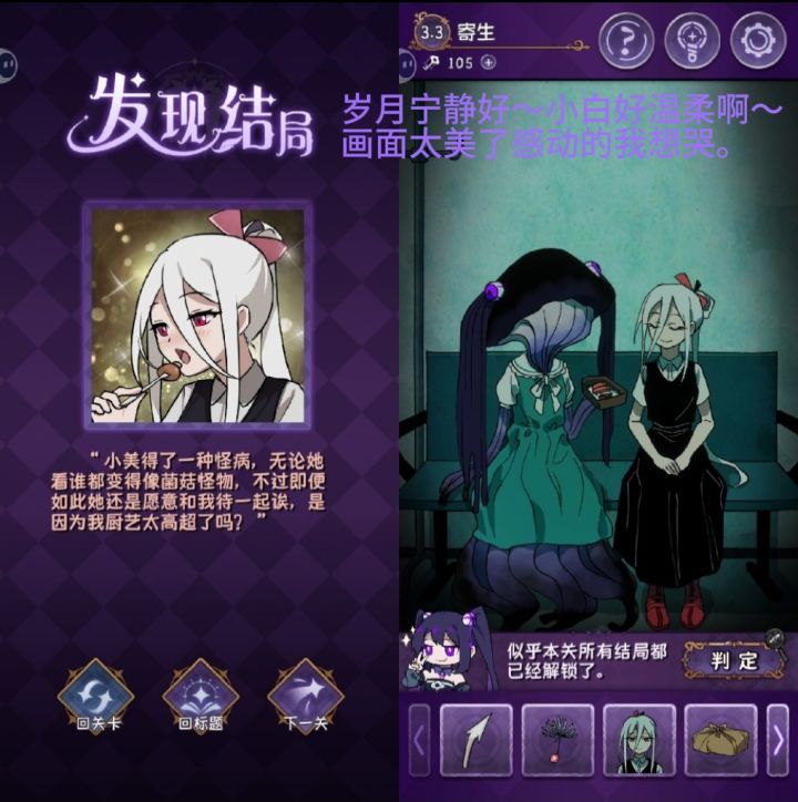 兄弟,打完其实有点空落落的,两个都是很美好的女孩子,完美和终焉,英文名也很好的对应了游戏名完美小姐她又没猜到结局(Miss Perfect and Miss Ending)很多图画的也很美啊,除了最后一关的多种结局探索很有意思。其实前几年就很想玩了,只是最近突然打开了这个,给我一种说不上来的感觉。我的文化水平凸显不出我的感受(恼。但是还是很推荐啊,游戏还是蛮简单有趣的,主线其实在前面与完美小姐