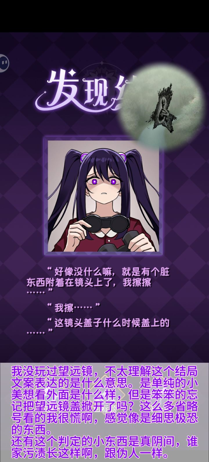 1.2的剧情是小美的哥哥,因为看到了窗外的故事怪谈里的“扭来扭去”,就发疯蹦迪、乐不归蜀。多年以后小美回到老家去调查哥哥为什么发疯。①蹦迪结局:小美耐不住好奇心看了一眼,和哥哥的结局一样开始蹦迪。有一种红舞鞋的即视感。②尴尬结局:呆呆的小美忘记把望远镜的盖子掀开了,但同时也碰巧躲过了灾难:发疯蹦迪。②猛男结局:小美看到了哥哥这么多年一直都在和怪谈小说的男主单挑击剑,看到了两个光膀子肌肉猛男,