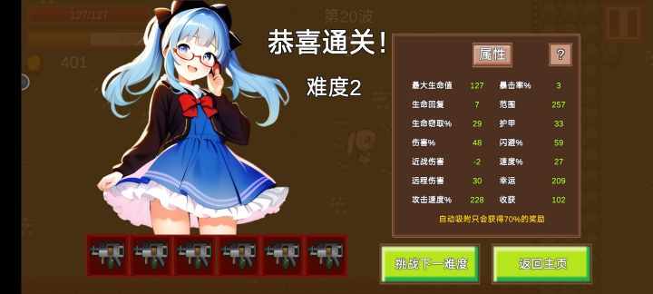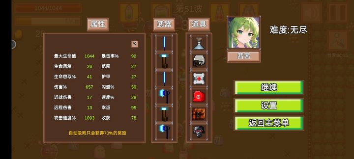 难度有点低,这无尽进了也只能一直打,不能暂时退出的么,50关出世界boss匆匆打完就跑了。主要6把属性成长武器,2攻速2生命2攻击加成,站撸!