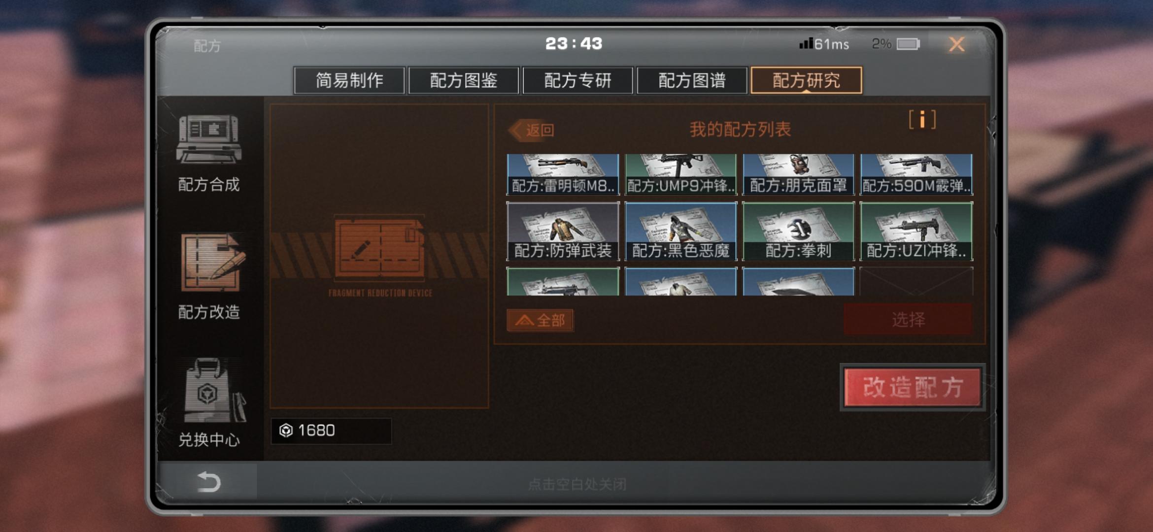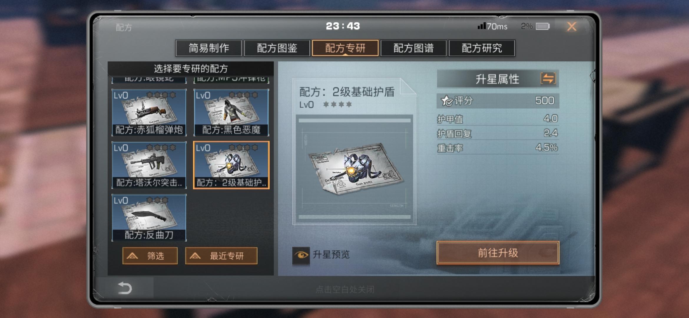 我游戏出问题了,我抽到2级护盾,不能配方改造,啥情况,配方改造没有护盾配方,可是我有这个配方