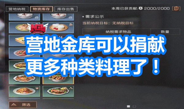小伙伴们大家好,我是超爱做料理的小啾,本次更新后,咱们的营地金库可以捐献更多种类的料理了!比如之前一直不能捐献的各种汤圆,海岛食材的料理,还有龙虾大餐!最令人震惊的是,竟然锦鲤刺身都可以捐献金库了!现在也都可以进行捐献了哟!(啥家庭啊,锦鲤刺身都捐金库了?!小声bb)当然还有部分活动料理依然是无法进行金库捐献的,例如大神慕斯,可乐小子饼干以及树根蛋糕营地金库可以捐献更多种类料理后,