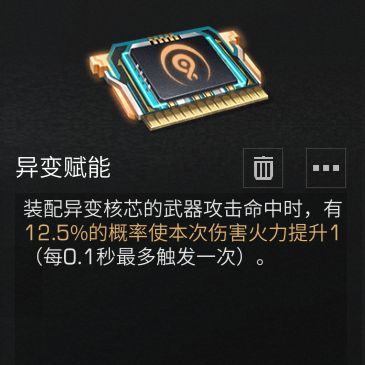 各位亲爱的幸存者明明今天为大家带来了新腰带芯片的盘点内容快来看看吧 特级芯片异变赋能异变赋能芯片搭配装配异变核心的武器在武器攻击命中时有12.5%的概率使本次伤害火力提升1(每0.1秒最多触发一次)如图在激活异变赋能芯片前对特殊感染体的伤害为154激活后伤害为228由于芯片技能的冷却时间短该芯片更适用于射速较快或者备弹量较多的武器如喷火器、步枪、电磁