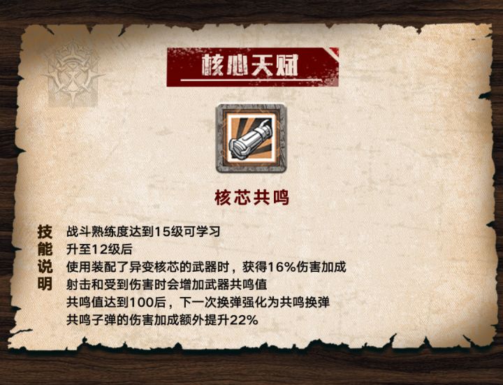 各位幸存者大家好呀今天为大家带来的是第五季全新职业方舟骑士的天赋技能介绍天赋技能核心天赋 核芯共鸣天赋升至12级后使用装配异变核芯的武器可获得16%伤害加成射击和受到伤害时会增加武器共鸣值共鸣值达到100后下一次换弹强化为共鸣换弹根据枪械种类为枪械快速填充一定数量的共鸣子弹共鸣子弹的伤害加成额外提升22%见习骑士见习骑士阶段可解锁技能精准射击、动力子弹精准射击