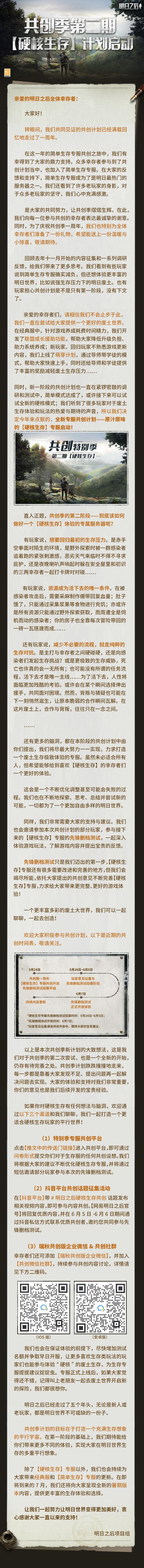 在去年,我们干了票大的#明日之后推出共创特别季计划#,希望通过设计一系列不同主题的专属服务器,实现各位幸存者对明日世界的多元化想象。所以有了第一个【简单生存】专属服务器。如今,我们共同迎来了共创季的一周年纪念日,衷心感谢各位幸存者的支持与陪伴。共创计划是大家一起努力的成果,我们非常珍视大家的建议与反馈,这些都将成为共创计划前行的动力。为了感谢大家一年来对简单生存专服的热爱与坚守,我们将为幸存者们