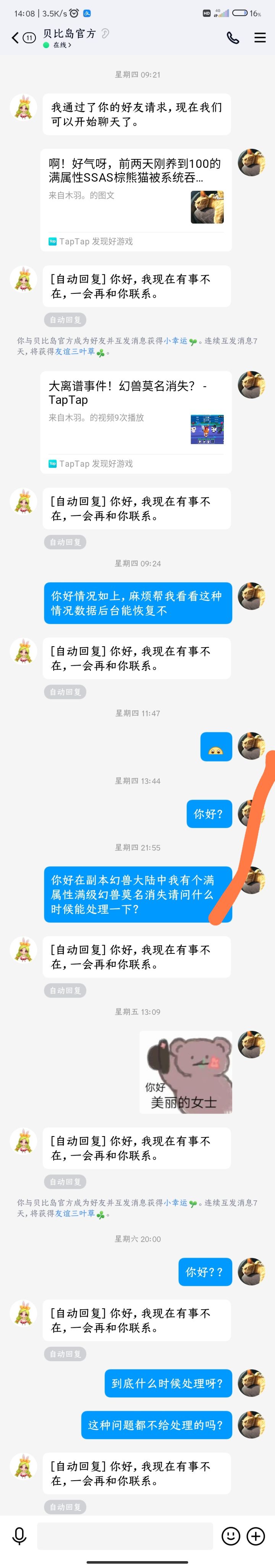 关于幻兽大陆副本中 我的满级满属性幻兽莫名消失(没分解,没升星) 找官方处理,但是官方失踪不予回复这件事拜托有友友教教我到底怎样才能联系上他们吗😔😥😿