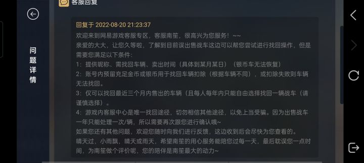 请问各位车长。官方是在帮我找回吗?😂😂😂找回的话是你的金币车卖出多少银币?找回时扣多少吗?官方的回复很奇怪啊,我很担心找不回。