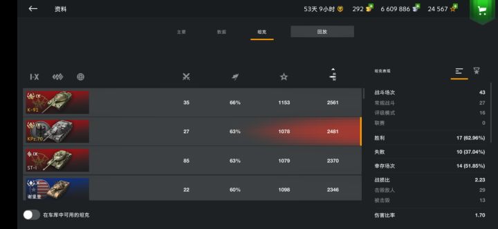 由于kpz今天买的,时间紧,加上评级只打了四十把,这是我匹配打了27把的数据,里面网卡了一把暴毙,不然两千五了,但至少百场两千三不是问题,k91加上评级已经一百多把了,这两辆车我玩起来觉得很舒服。虽然只有及格场均(´;︵;`)首先是k91,银币弹一轮爆发一千零五十标伤,但是需要七秒的输出时间,加上七度空间(俯角)很舒服,可能是我玩法重的原因,玩这车手感还是可以的。装甲方面摆角度首上和侧面还是能