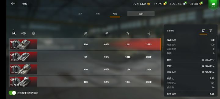 写在前面:本帖是针对E100的单车攻略,内容较长,请耐心观看。发图证明我玩过==此为楼主配件选择,供参考(之前没钱所以没开9配):基础数据(由于楼主隐蔽已经点满,因此数据采用BlitzHangar0技能100%成员数据,配件如上图,双口粮补给)基础数据游戏内就可以查到,不多赘述,主要谈一下游戏内查不到的数据:火力:穿深:258/334/85均伤:640/550/960弹速:757/