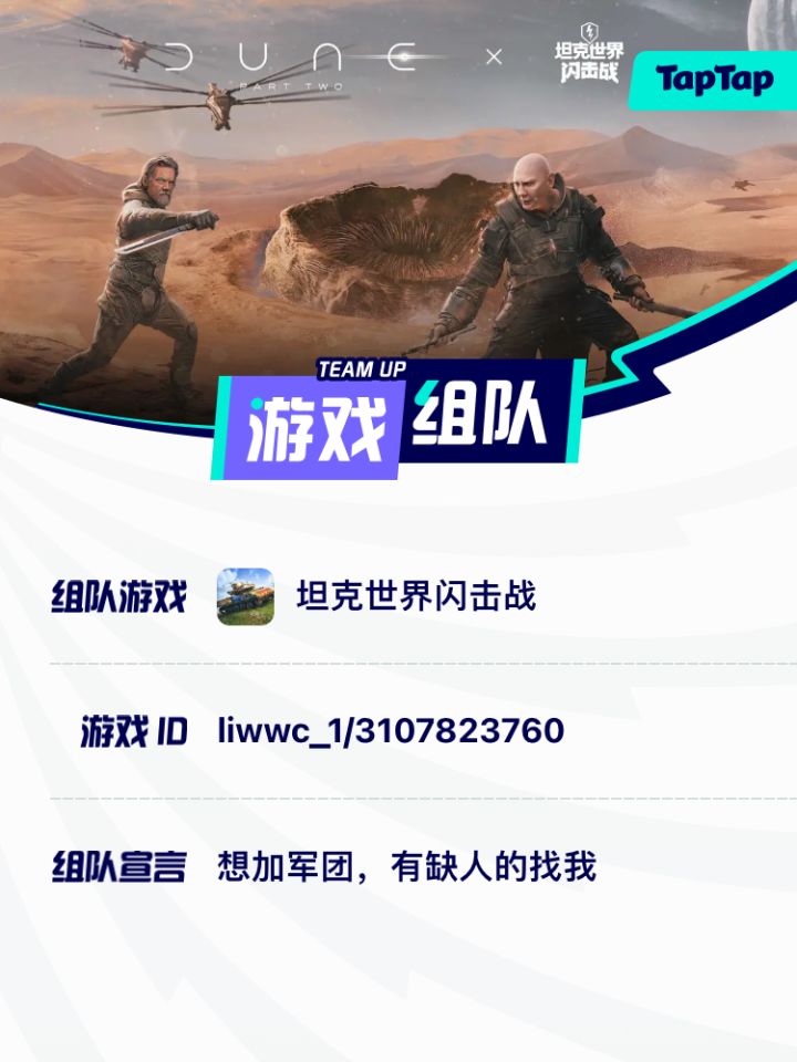 非常需要大家加入54659十级军团,每周都可以打满奖励,而你只需要每周做够七个军团任务,只要和团员组上队简直没有难度,快来加入吧#坦克世界闪击战
