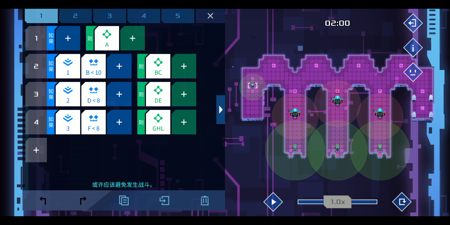 攻关思路:视野宽的机器人先去吸引敌机,边打边撤退,当退回距离c点4格时激活另外一个机器人,稳定过关。