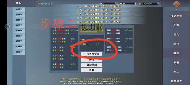 【步骤1】把你所有笼子放在远离人的地方(视野上看不到人就行,推荐家园周围)【步骤2】放好笼子后点,屏幕右边房子→捕捉→召唤大宝管理。然后给大宝设置5分钟收获间隔。【步骤3】之后啥都不用理,就是等时间了,切记中途不要走任何收笼子、放笼子的操作,不然会前功尽弃,其他打副本做任务啥的都可以,千万不要放笼子和鱼笼,推荐十几个小时后再收。【步骤4】收菜!先备好一两千个面包(挂机时间越久需要越多)。收菜