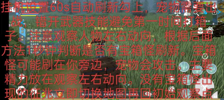 首先得有秒杀宝箱怪的战力评分!方法一:1954,1928这个坐标1)挂机肯定是要点上的,否则人物就不会动,人往哪几个方位跑,就说明那里刷出来了,直接骑马过去找;2)主要就是观察判断,其他没什么好说的。说白了就是让你去找宝箱怪,宝箱怪不会刷新你在人旁边;3)用法杖带弓箭技能,用弓箭就带法杖技能;方法二切图,即是离开场景再切回来这个可以利用游戏内挂机+自动精灵设置基本属于自动操作。1