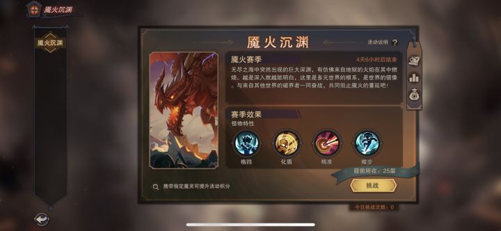 【攻略】魇火沉渊25层boss小技巧此攻略仅适用于已过24层,卡在25层的破界者武器选择燎原斧技能携带 撞 拉 吼 3秒真男人天赋携带 都卡在24层了,开局就是25boss,当然是尽可能多的带攻击天赋/舍身除外攻击类如 执着,连击,精准,攻强,痛打,节奏,挑战者,盾噬,夹击,全力以赴,藏锋,丧殒等元素类如 灼烧打击 火攻强化生存类 只推荐吸血,生命盾 没有吸血就嗑药 辅助类 融火必