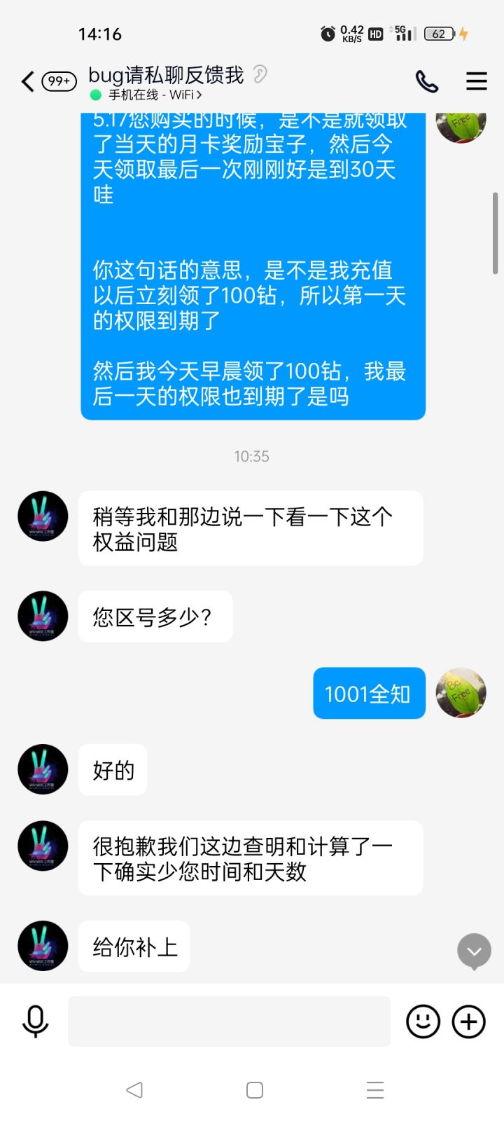 今早发现月卡到期了,但是日子应该差两天,就反馈一下客服,整体沟通起来还可以,客服反馈也还行,肯定是他们的逻辑代码问题,应该大家都是这样,只是有的人不注意,此后大家应该不会差了,只是客服上号检查,大半天没玩,下午上线体力都满了,不想玩了,这一个月下来也挺累的,弃了,斧头买了,还没来得及玩,不能退款了。
