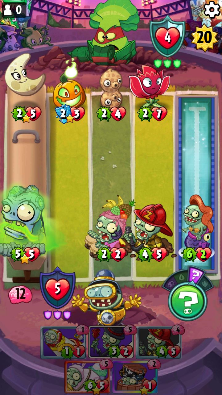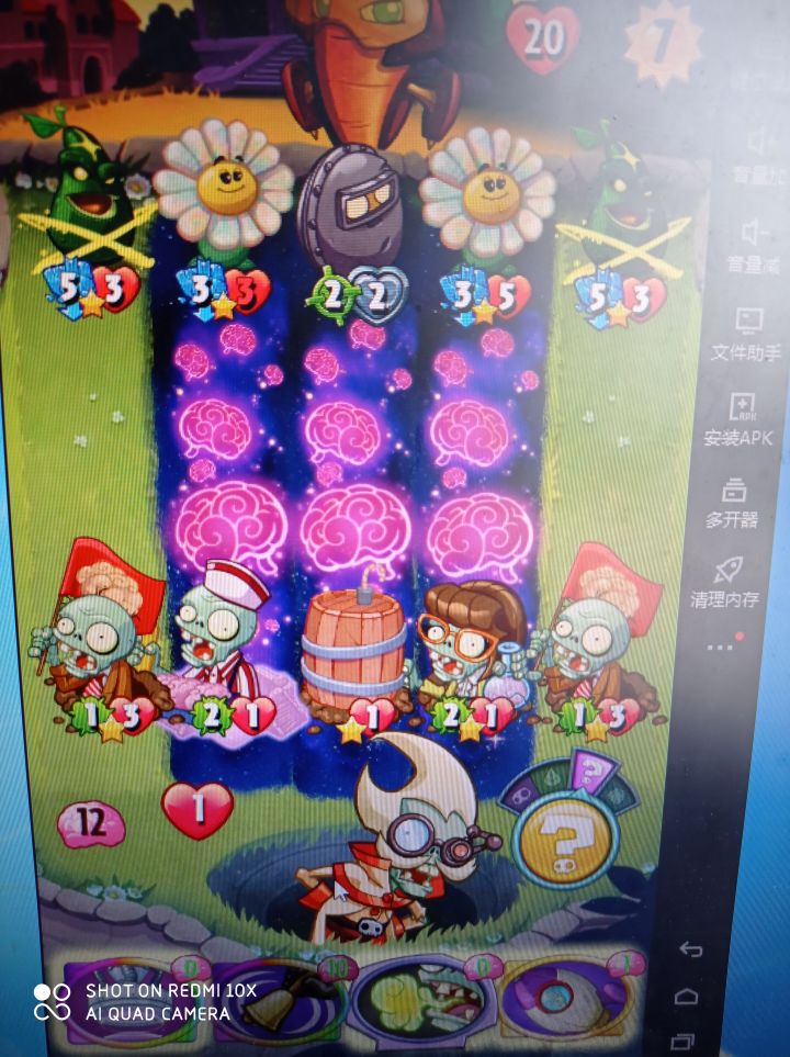 我的思路是先四路放复制环境,前三路随便把两个星际菇拍出去再放复仇菇,剩下的一路放复制小喷菇,这样第一波一共打出13伤害(这图是失败实验,复制环境必须放四路)然后第二波用岩浆去炸桶,由于复仇菇放在四路所以一共能打出7×4+2=30的伤害,其中有8点伤害会打到两只僵尸上,所以对英雄是22的伤害然后是最后一波,这三张牌先把复仇菇放四路,然后直接锦囊牌全体+1+1,复制小喷菇放三路,如果运气好,生成