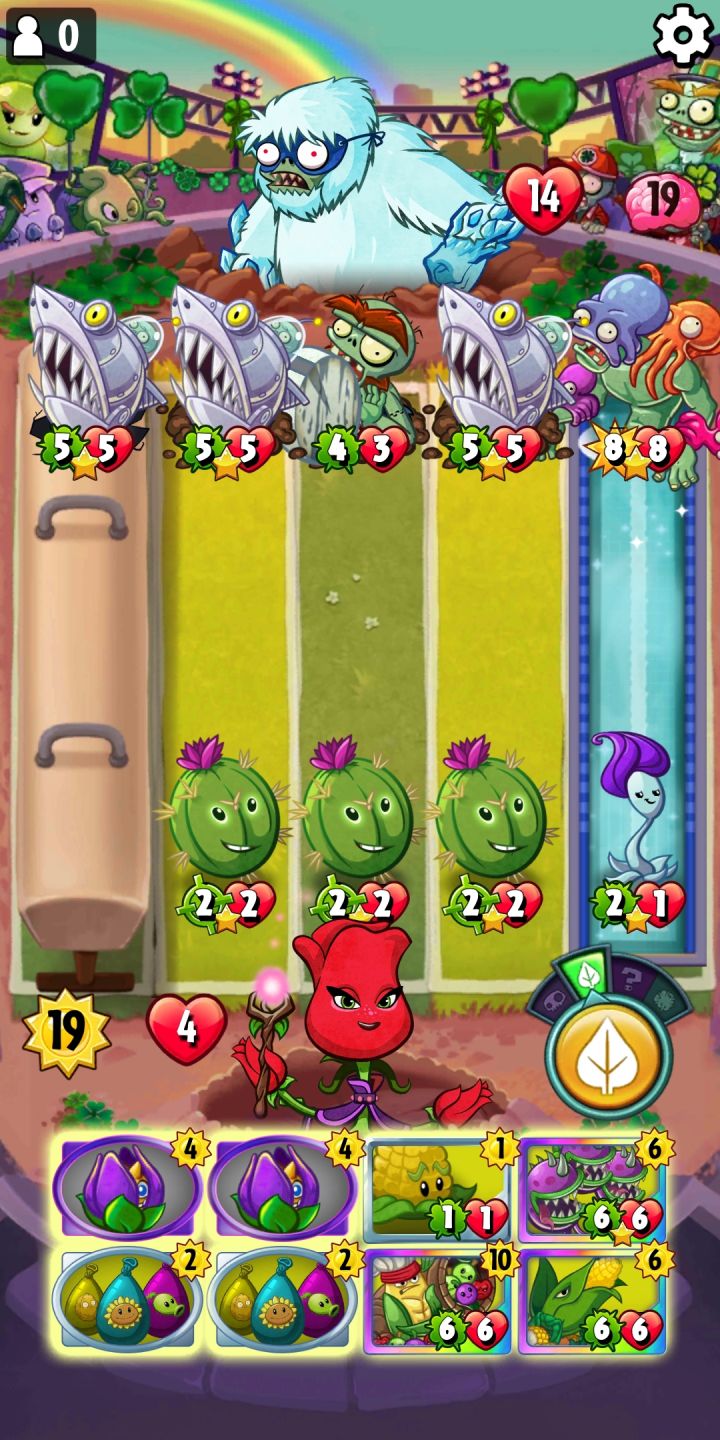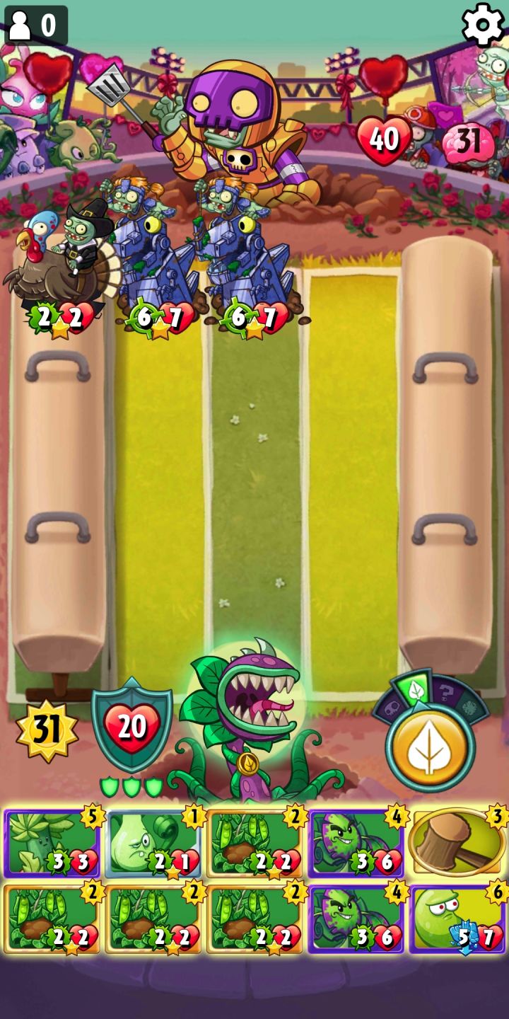 趁着还没上课赶紧把今日解密给做了,不然无故断更就不太好了直接进入正题解密难度:★★★☆☆是的,今天还是三星难度,本来想给个四星的但是我试了三遍也就过了,所以还没到四星(五遍)的个人标准😂简单来看一看,每条线都有僵尸,还要一回合打出14点伤害,场上植物总伤害为8点,手卡中植物最高伤害为6点,所以就是说我们要把五条线上的僵尸全清干净了那么下回合才有用的三头大嘴花肯定得先排除了,丰饶玉米角10