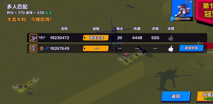 军团建议1可设置职位的个数(有上限),职位的名称可修改2贡献值可以通过吃鸡数,或者飞艇来提高3有些人是通过军团排行榜加入军团的,可如果点击后能显示军团信息就更好了,而不单单只显示皇冠数 4军团达到一定等级,可修改一次团名5增加军团福利①比如军团四人组队玩多人,可加1点伤害②军团团员,吃鸡有加成(视军团等级而定)③军团每天/每周可领取N个钻石,④或可以取消吃鸡月榜(没奖励),增加军团