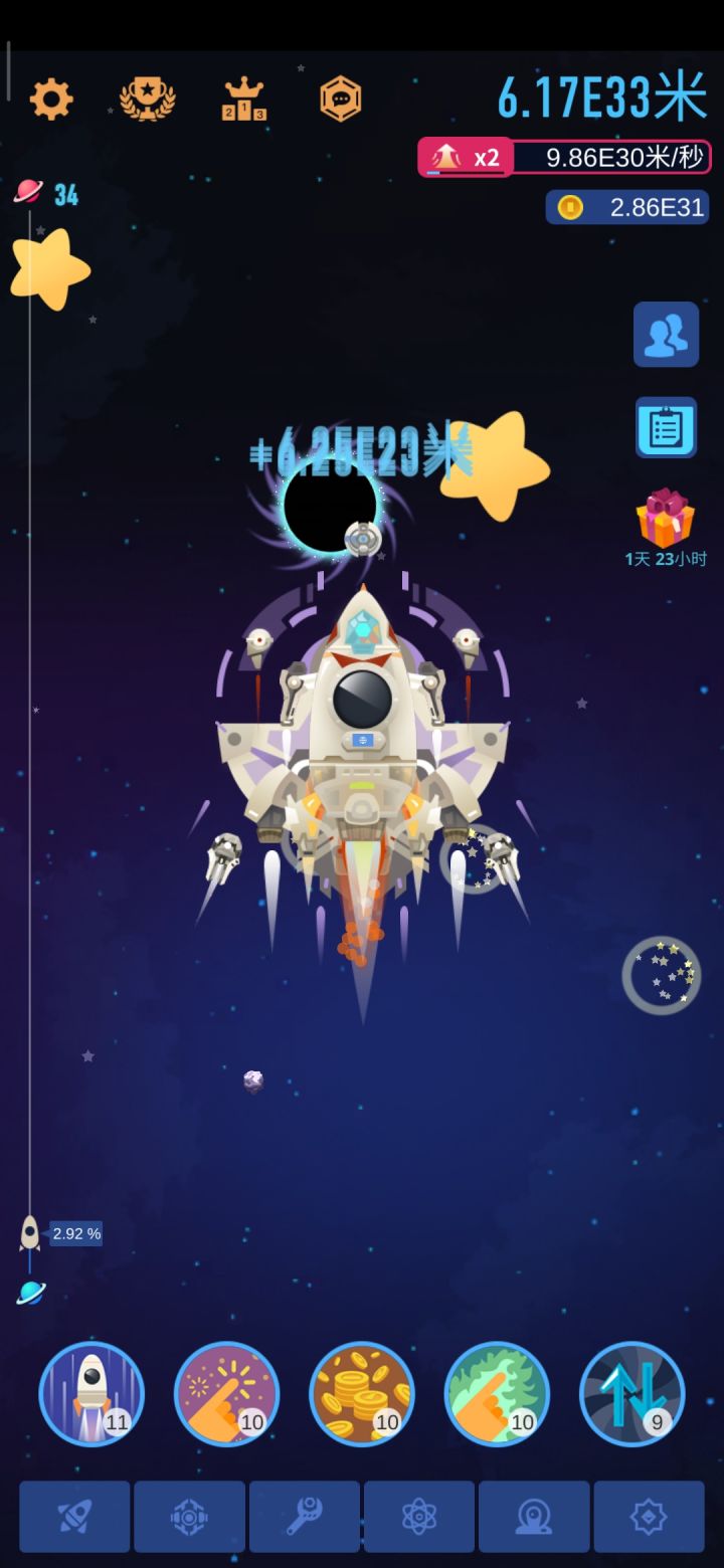 放置游戏适合佛系玩家个人感觉这个游戏画面干净整洁,不扰人,轻松愉快,每次打开游戏,看着游戏的收入,都能带来一点好心情。不点击加速,懒得收集星星。一是因为时间收益>努力,二是因为懒所以于此相关的提升可以不用升级,升了也不用。开启到星提醒,免得飞船停飞时间太长。其他提醒不开,这个app不会打扰你。如果到下一个星球时间太长说明,你要回家一趟,运回移民,给飞船速度提升一下。在到这个星球的这段