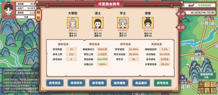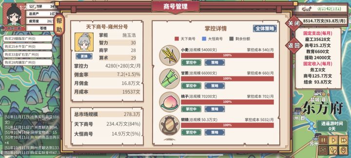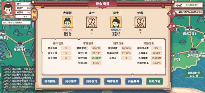 进入进入商号之后,他肯定会有一个这样的界面出来,所以首先最重要的就是能看懂他到底讲的是什么意思。首先是这个掌柜,你只用把拥有图片里的三个属性高的人物放进去就行掌控力:旁边的物品上有一个很长的条子,掌控力就是每个月会增加这个条的数值,直到这个条被你和对家填满。佣金率:这个商会赚完钱之后,收益乘上这个佣金率就是给你的钱。策略:不论是全体策略还是单个物体的策略其实都是一回事,宣传:只增长自己的