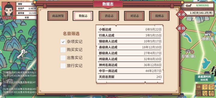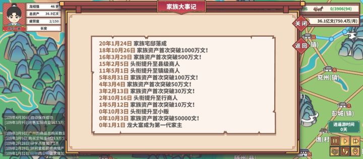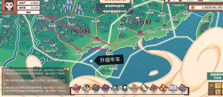 开局选择普安→宜山→桂林→广州→南方府逛一圈,解锁完商品回到象郡→交趾→大理→交趾→昆洲→宜山镇,逛街的时候买赚钱的商品。随后的主要活动范围为象郡→广州→桂林→循环往复,每年看一下这三个地方的任务,有这三座城的商品任务先接着。换车分别为1级车→1+3级车→3+3级车→3+3+6级车→3+6+10级车→6+10+10级车→最后全换15级车→中途不要开商会,西南府100优先拿道具。等3辆车15级