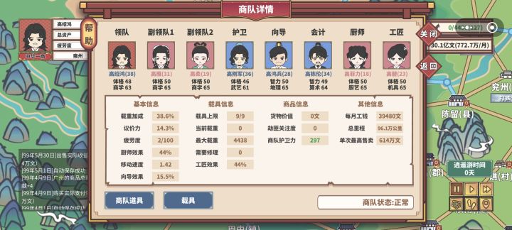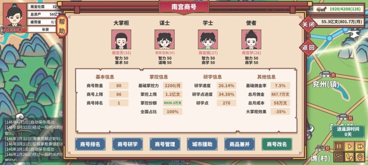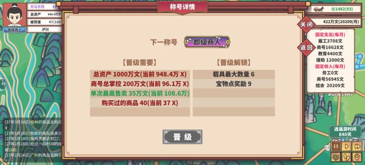 说说个人看法:前期可以在黄河流域发展经济,这个地方商品价值高。能够建立商会就建立,然后快速占领黄河流域。只要等收入每月不为负的,就可以进行下一步了。中期往外扩张,占领每个区域的州级商会,逐个解锁州级商品。然后郡-县-镇-村。解锁的同时搜索州级,可以得到特定物品。后期通过商会里面的城市援助获得城市贡献,这个很快。不用到处做任务。最后就是一步步占领所有市场了。给各位游玩的人一个小诀窍,酒