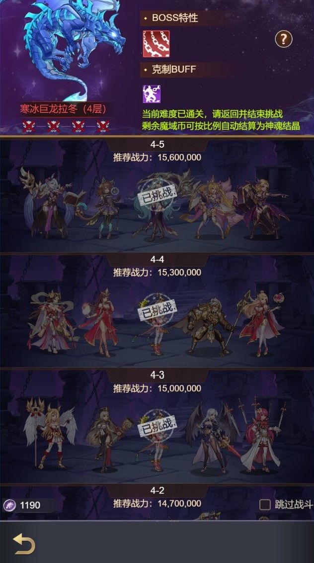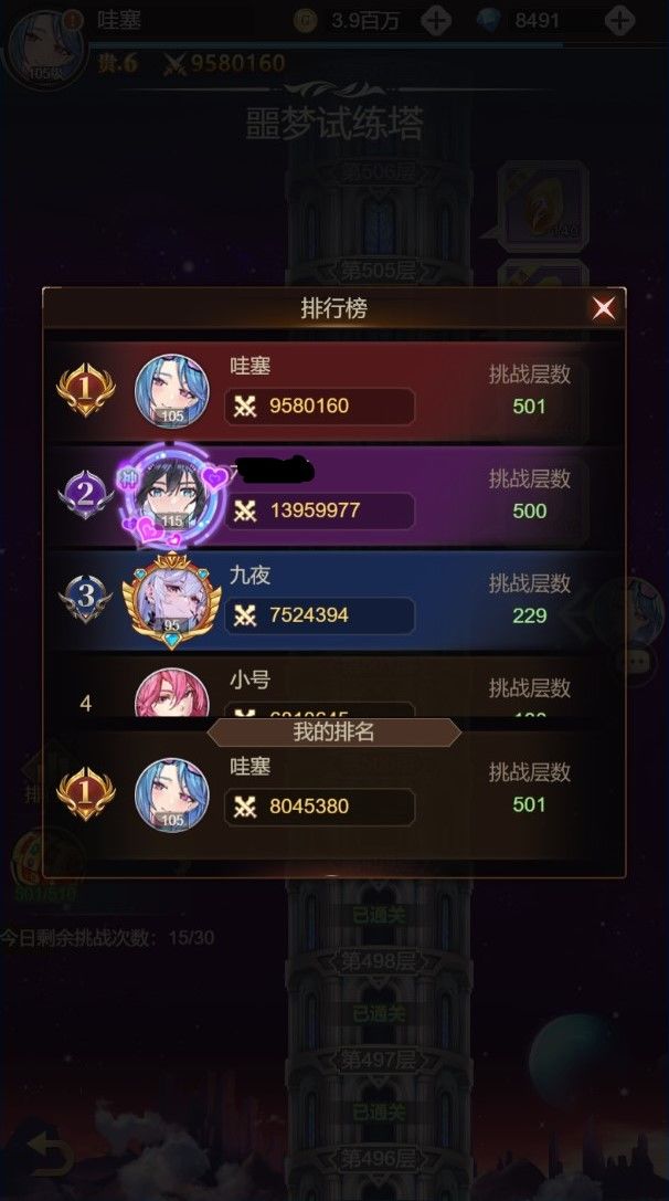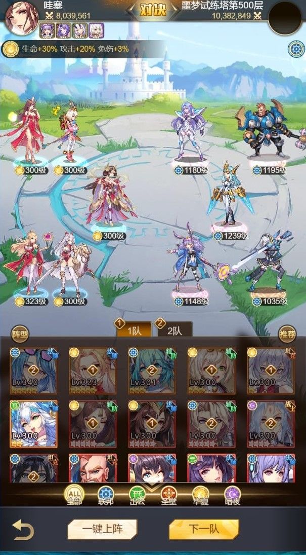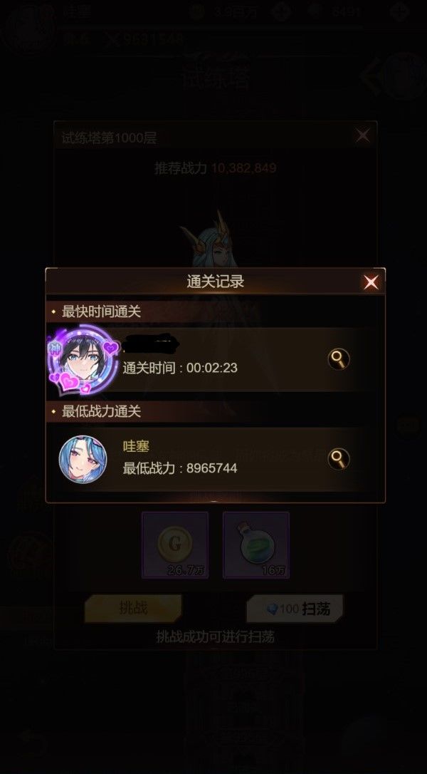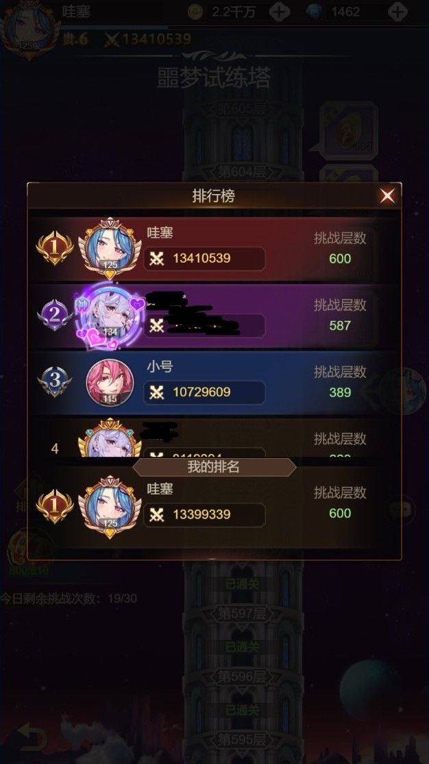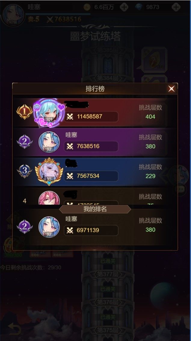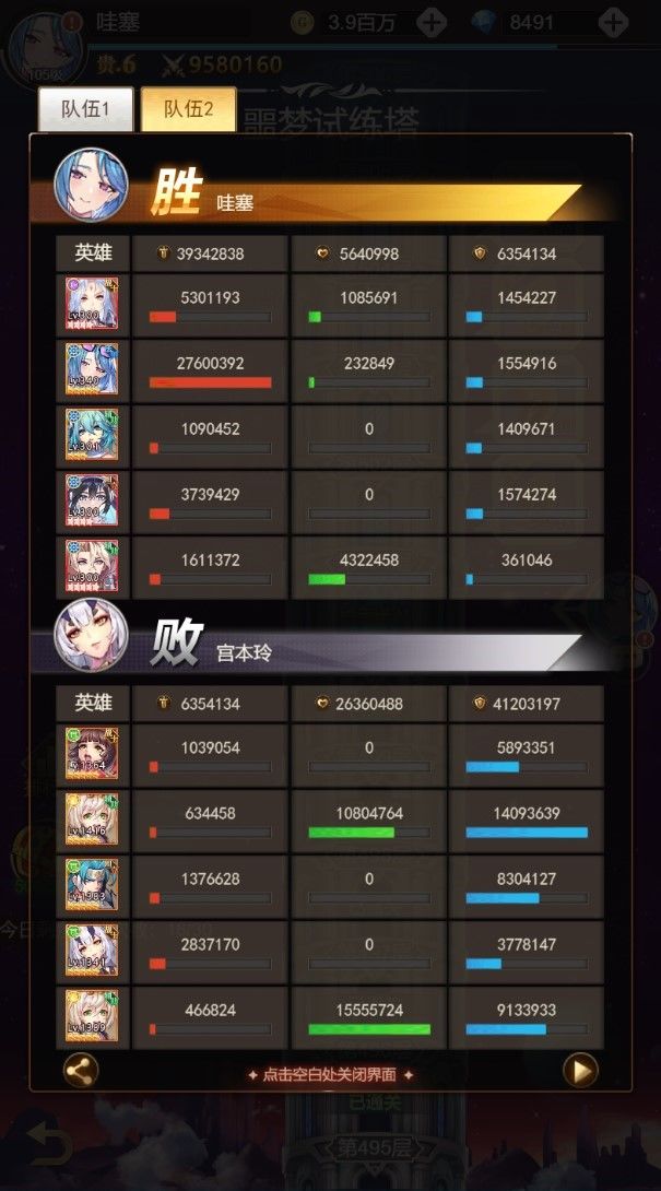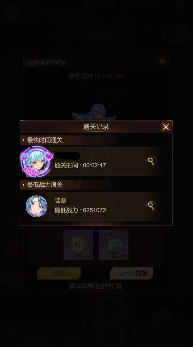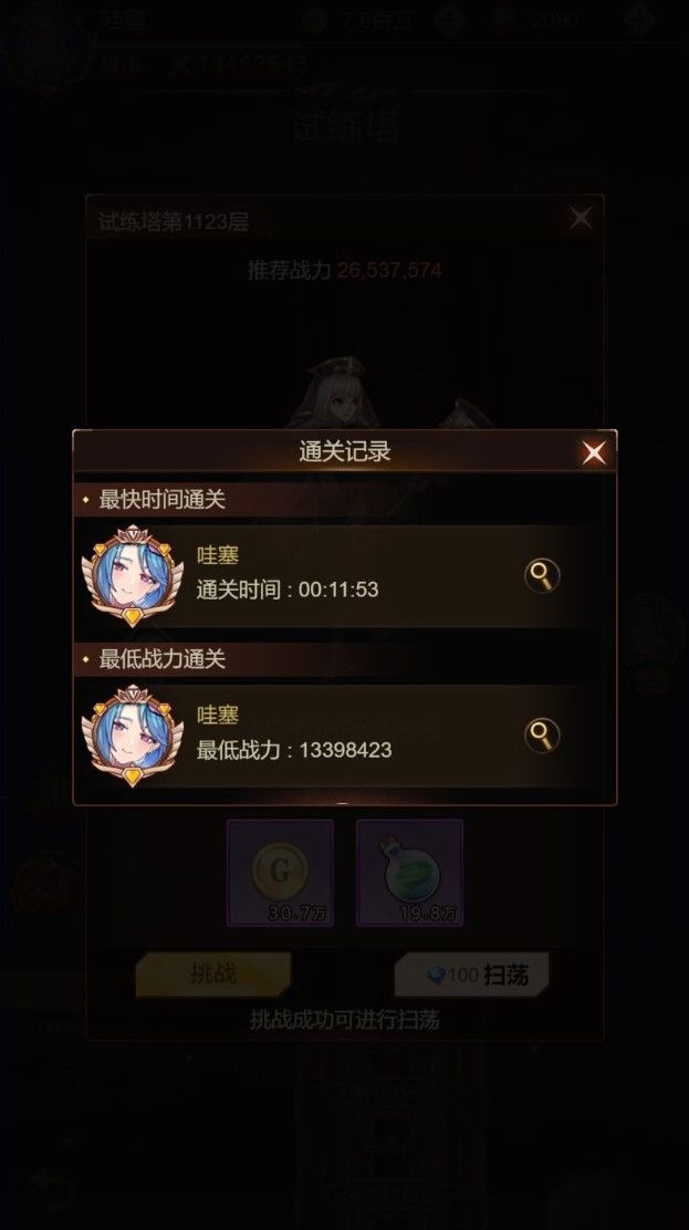 本人H5端玩家,小V,主玩PVE,乐于挑战各种极限。即一个月前给大家带来极限战力通关噩梦试炼塔380层后,又给大家弄出更震撼的极限战力960W通关噩梦试炼塔500层。有多少玩家战力1000W以上连普通试炼塔1000层都过不去的,举个爪~ 噩梦试炼塔500层,由普通试炼塔1000层,和普通试炼塔900层2关组成。这里选择用不成形的光法800W战力挑战第一关,这关DPS生存压力不大(普通试炼塔100