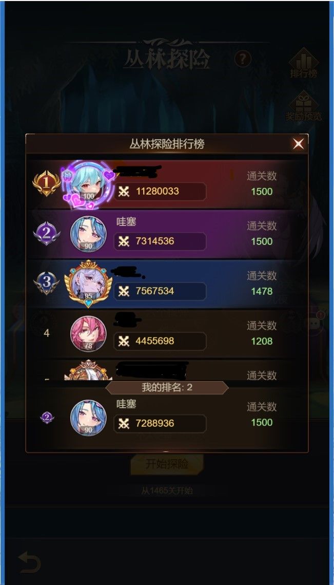 大家好啊,时隔2个月我又来了,还是那个热衷于极限挑战副本的小V,依旧还是玩着联邦光法。(人物战力图1)本篇从易到难给大家详解极限通关的小技巧,希望给还在被副本卡关而懊恼的友友们一些启示。首先说最简单的丛林探险(图2)本人战力1240W的时候打通了1800关,新版的丛林探险加了300关,新增关卡全部是光暗的组合,难度大了不少,暗的爆发很高,队伍需要一定的生存能力,对于输出能力倒是没啥要求。因为