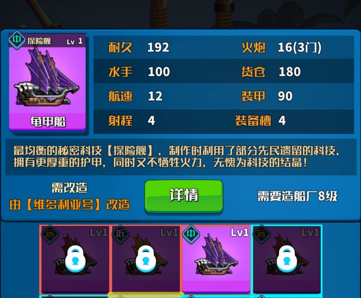 船只:复仇女王号 装备:火炮(重型长炮) 帆(三个大三角帆)装甲(全精钢炮击装甲)船首(女神像)撞角:无 甲板炮:(加强燃烧炮) 船只等级:LⅤ.8 舱室:船长室(LⅤ.8) 水手室(LⅤ.8) 火炮室(LⅤ.8) 火炮室(LⅤ.8) 火炮室(LⅤ.8) 引擎室(LⅤ.8) 仓 库(LⅤ.8) 船员 弗拉海姆(LV.60)位于船长室 阿尔弗雷欧(LV.60)位于火炮室 莫斯瓦森(LV.60)