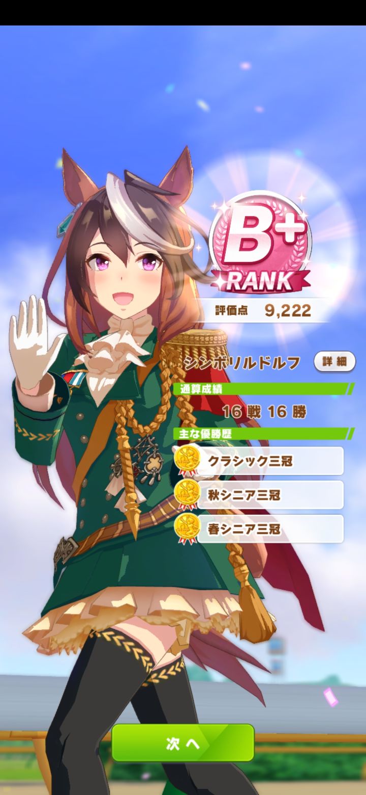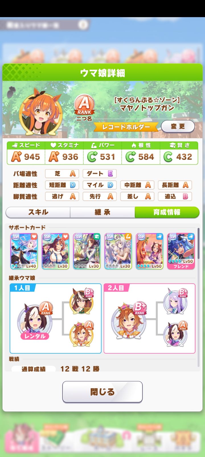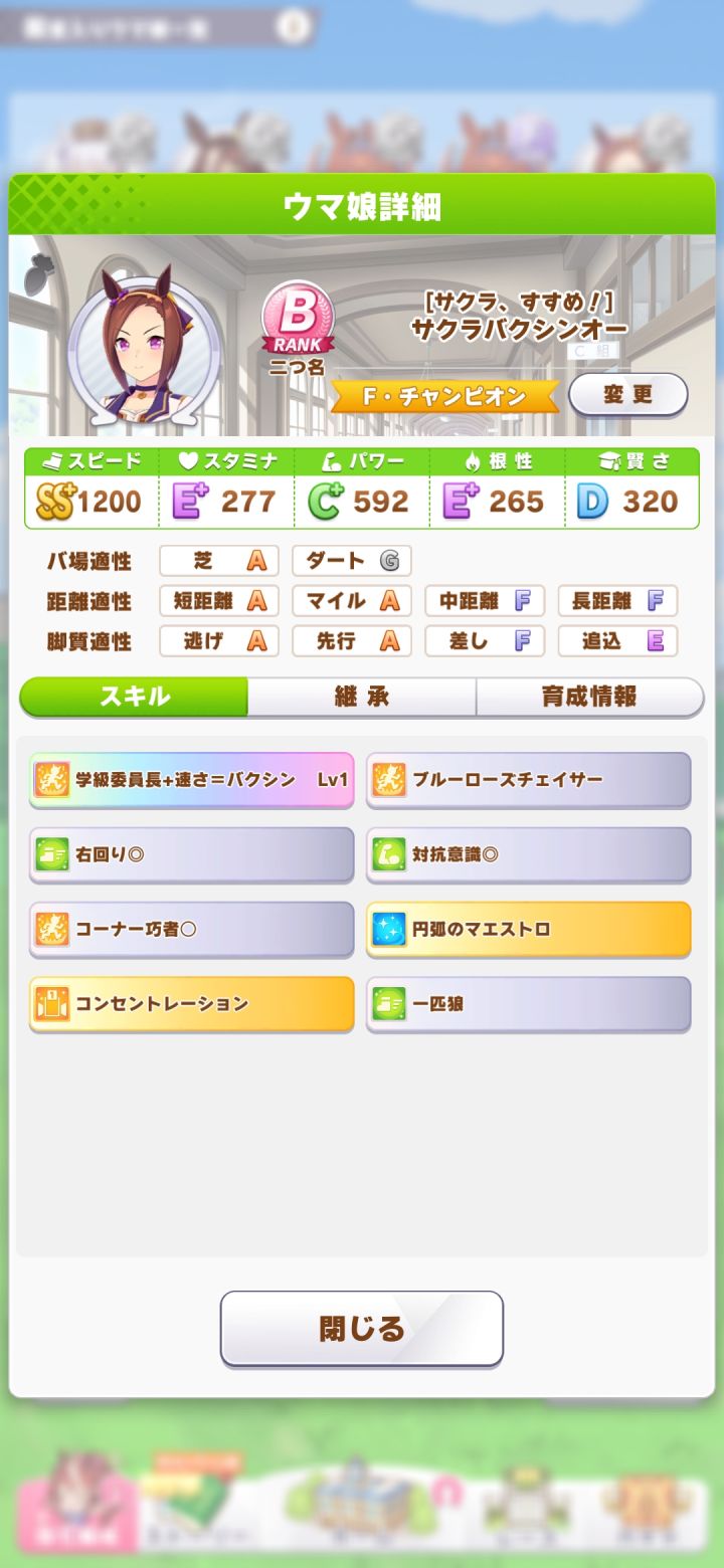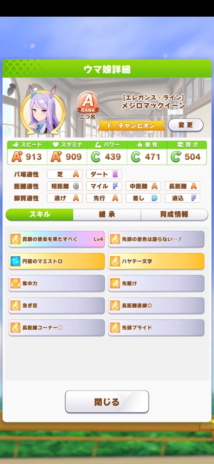 入坑不到一周,试了几种刷A马都没出,最后还得是智速流小海湾,二星二觉,种马是自己的二智二力三速神鹰,借的九速高达。 支援卡很平民,耐力全靠技能。 主点智力,多打比赛加技能,但我这智力打决赛前就满了,溢出了30多,没计算好( 0 x 0 )