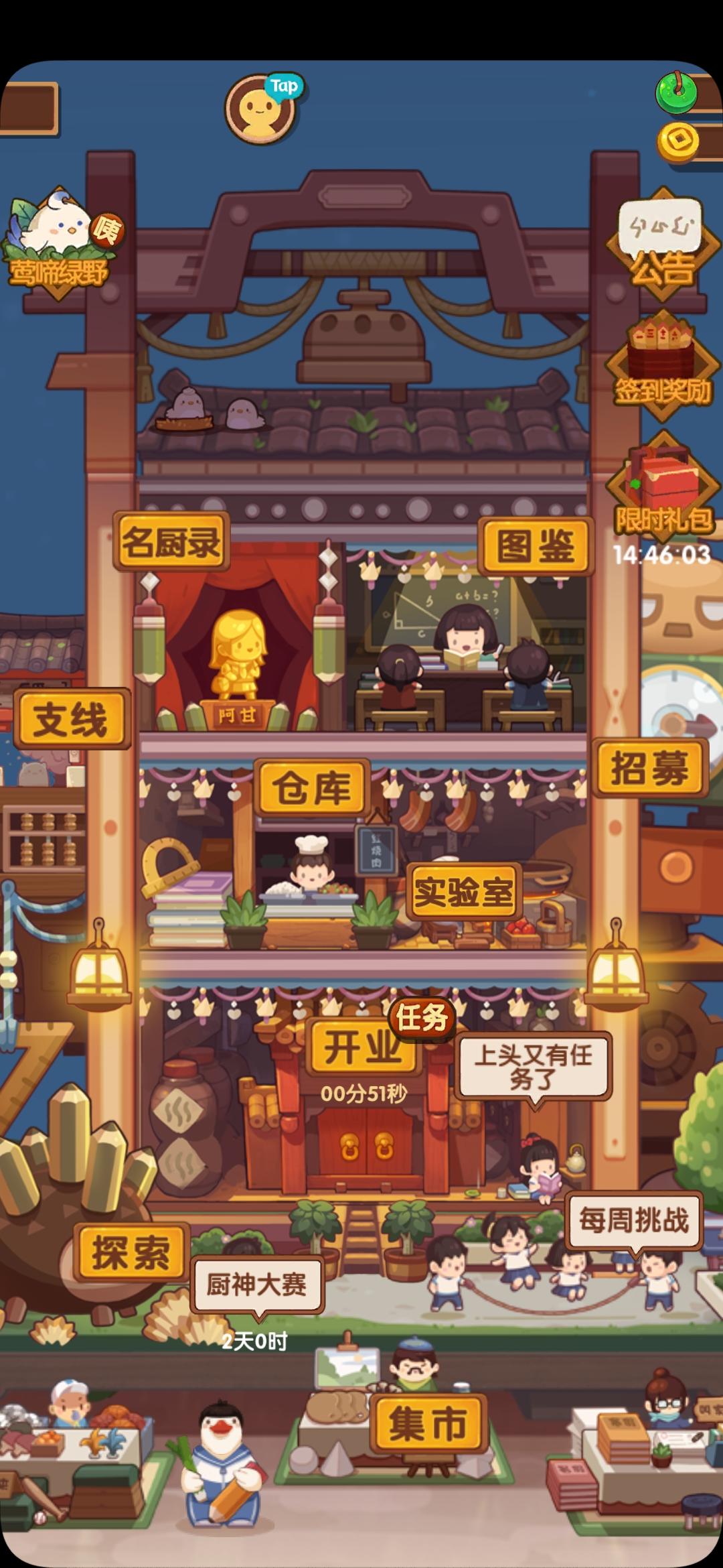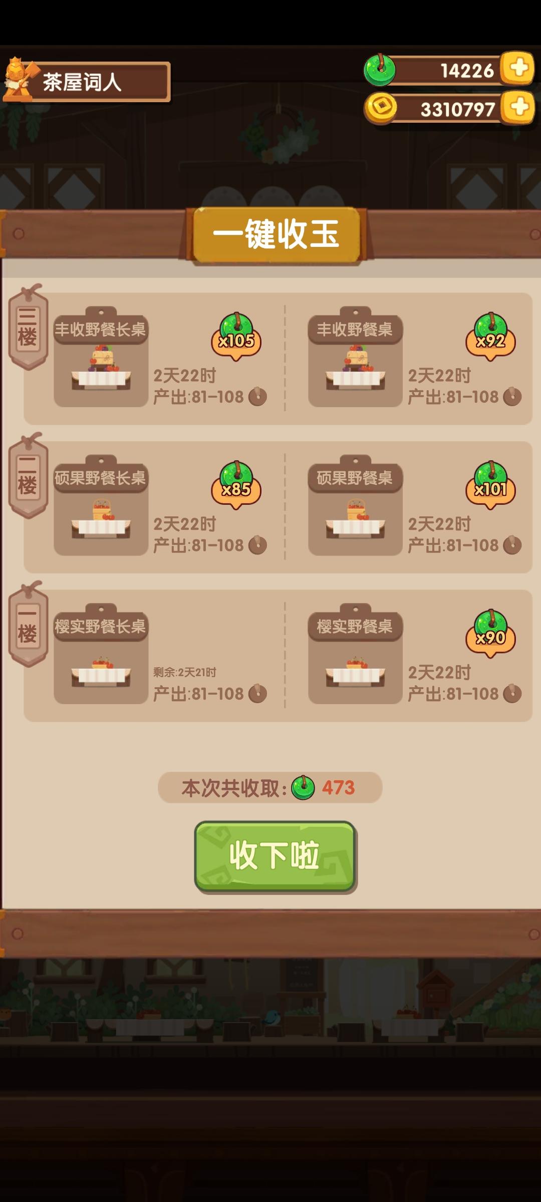 游戏感觉玩到倦怠期了,开一次业一天……活动做完没啥玉璧,金币也不多,修炼差不多,任务卡到4000个菜品那个,看着即将更新的复刻活动……没钱啊,抽不了,是不是要攒一季,等下个活动😓