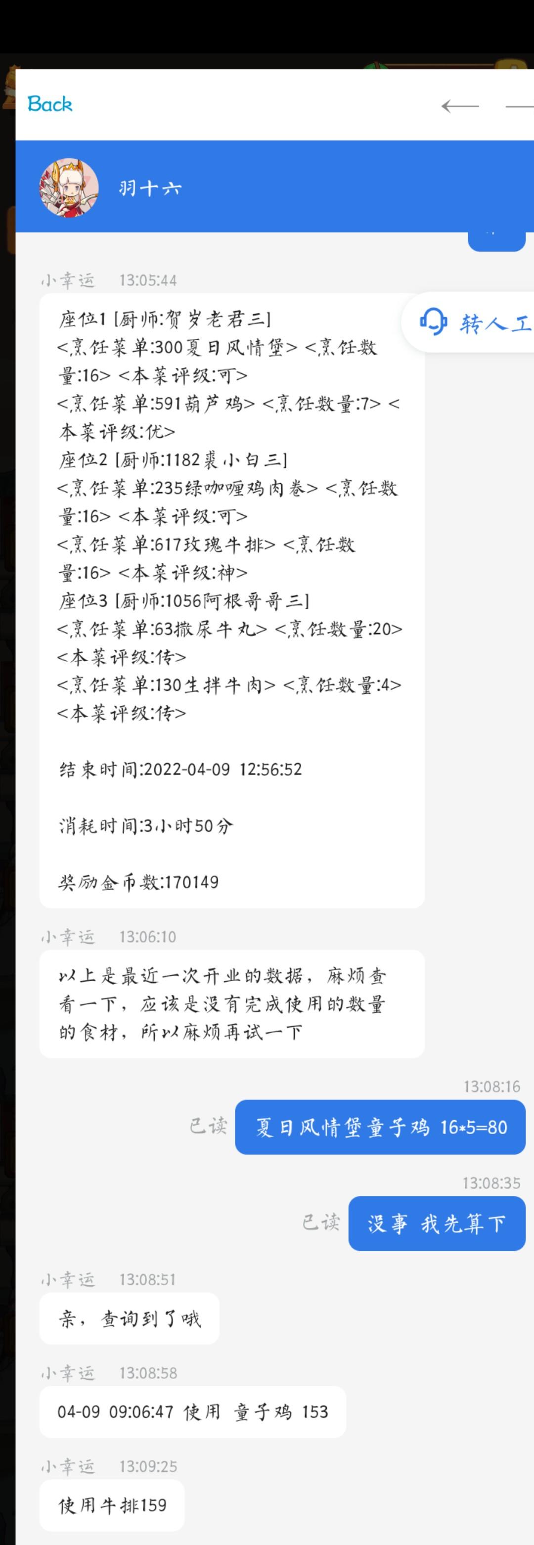 如图是后台的开业信息。夏日风情堡16份,葫芦鸡7份,绿咖喱鸡肉卷16份。童子鸡耗材:16*5+7*3+16*5=181。然而后台数据是153。玫瑰牛排16份,撒尿牛丸20份,生拌牛肉4份。牛排耗材:16*4+20*5+4*5=184。然而后台数据是159。有没有小伙伴帮我一起算一下,看下是我算错了,还是别的什么原因。