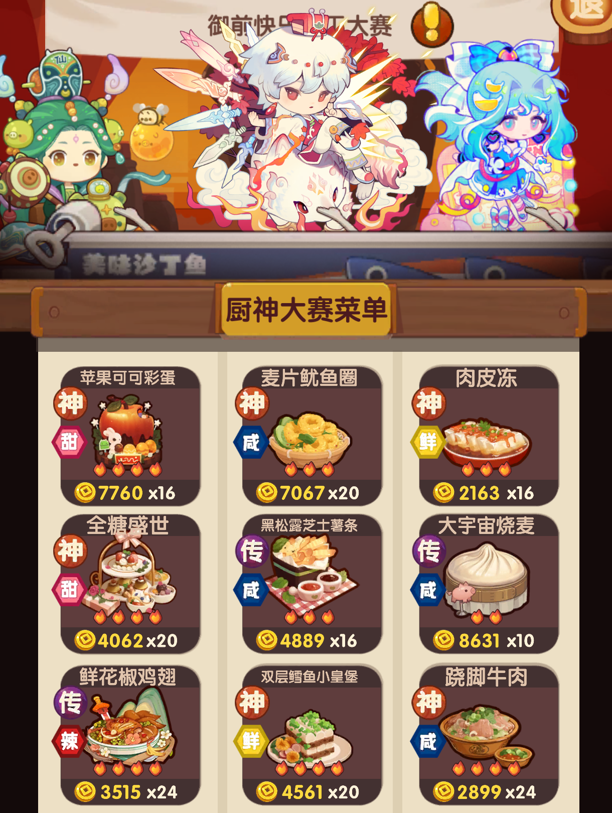 推荐购买肉蟹煲(125炒 50炸,⭐️)炒果菜,味大无需多盐,除非你奔着国庆池的基修或者捞沙爹拼盘去的,否则无论是刷炒果还是修炼都是极好的菜,如果你没有炒果菜必选。孔雀开屏(110切 70蒸,🔪)利刃菜,并且是后厨高分菜蒸汽海鲜的前置。鉴于狗春的强度十分的小杯,基本不是什么正经补池会考虑的,直接购买可以一步到位获得利刃菜和后厨前置,并且其技法较低也适合修炼使用。注意别买成孔雀迎宾了!清蒸
