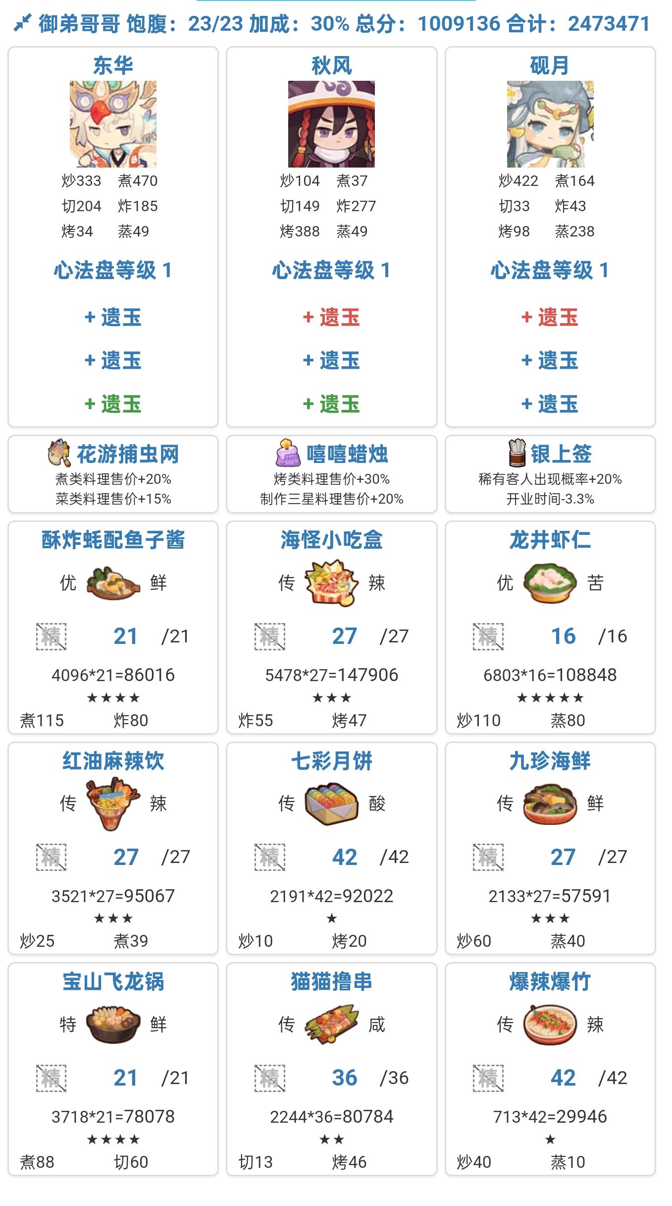 2025.12.18更新主要更新采集阵容和神菜拔丝雪梨,直接上图:(裘小白+残雪+莫扎特仍为当前效率第一阵容,食材消耗在可控范围,具体数据不赘述。蓝兔很好用,全技法+77的被动加成下,菜谱覆盖率很高。蓝兔+关羽+飞星是个很不错的阵容。)日间符文过夜符文江湖帖调料区玉片区食材区2025.06.18更新更新玉片及食材采集阵容2025.02.11更新分享一个速刷贵客阵容,800后